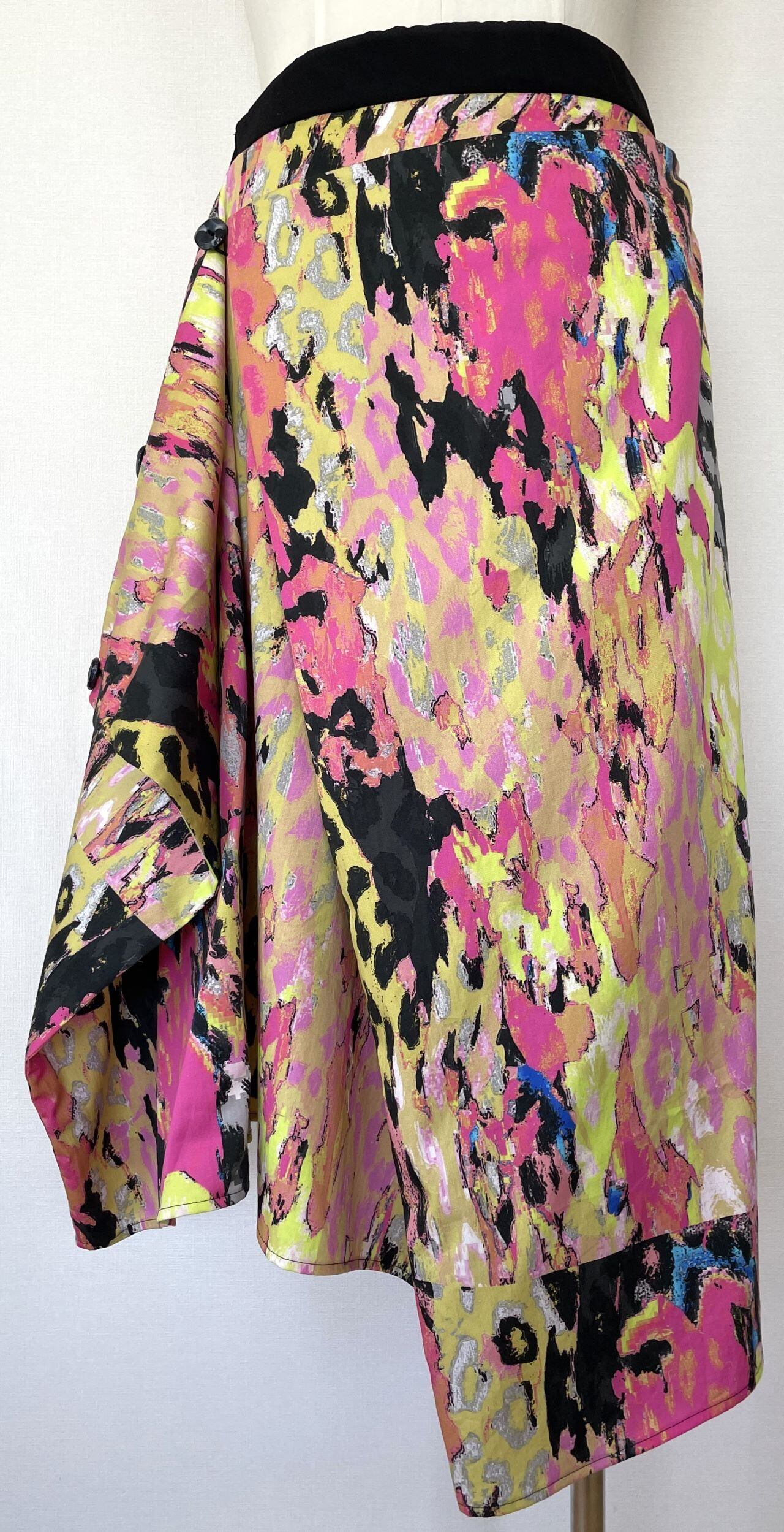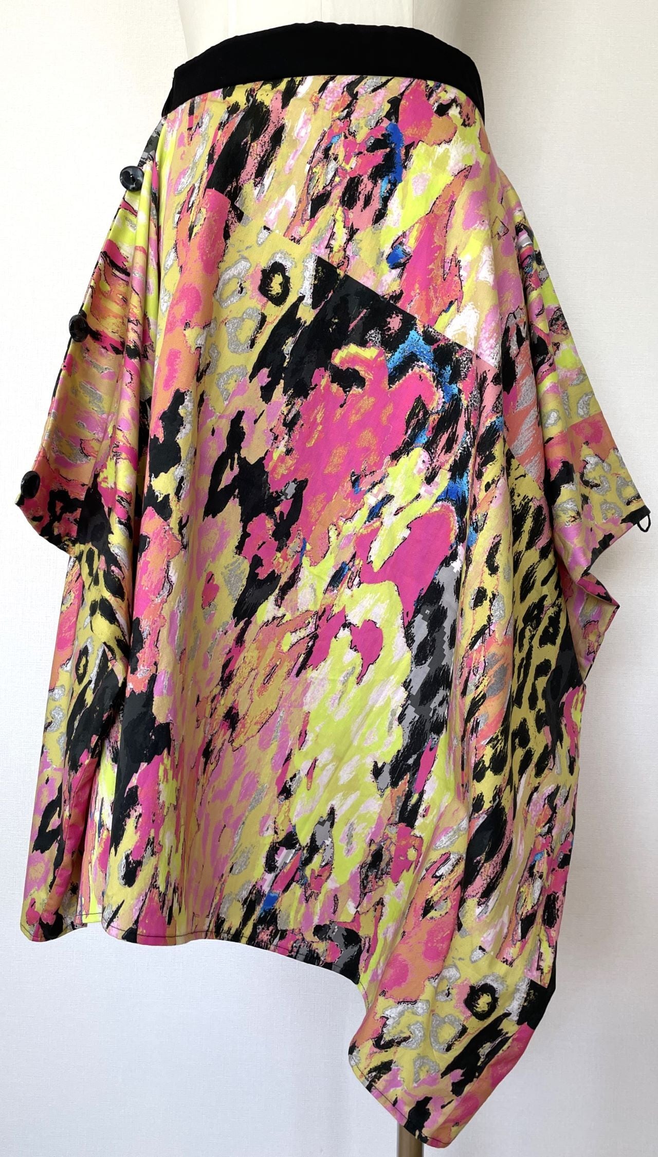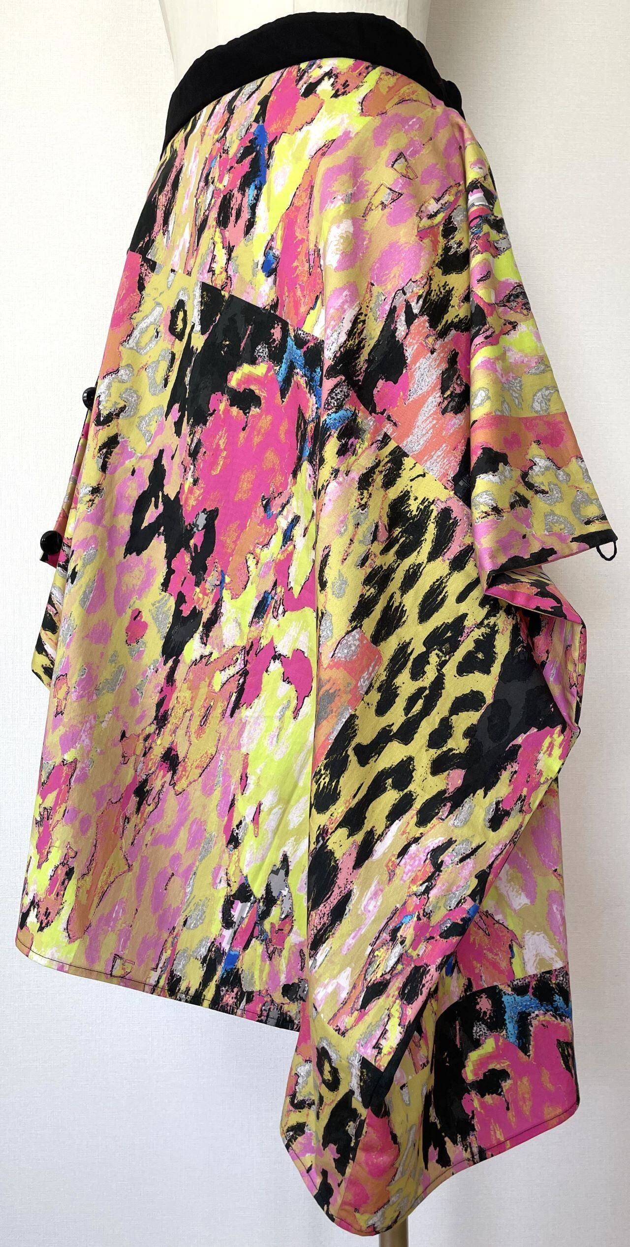 オリジナルのデジタルアートをプリントした生地で、デザイン、型紙、縫製まですべての工程をデザイナー自身が行いました。