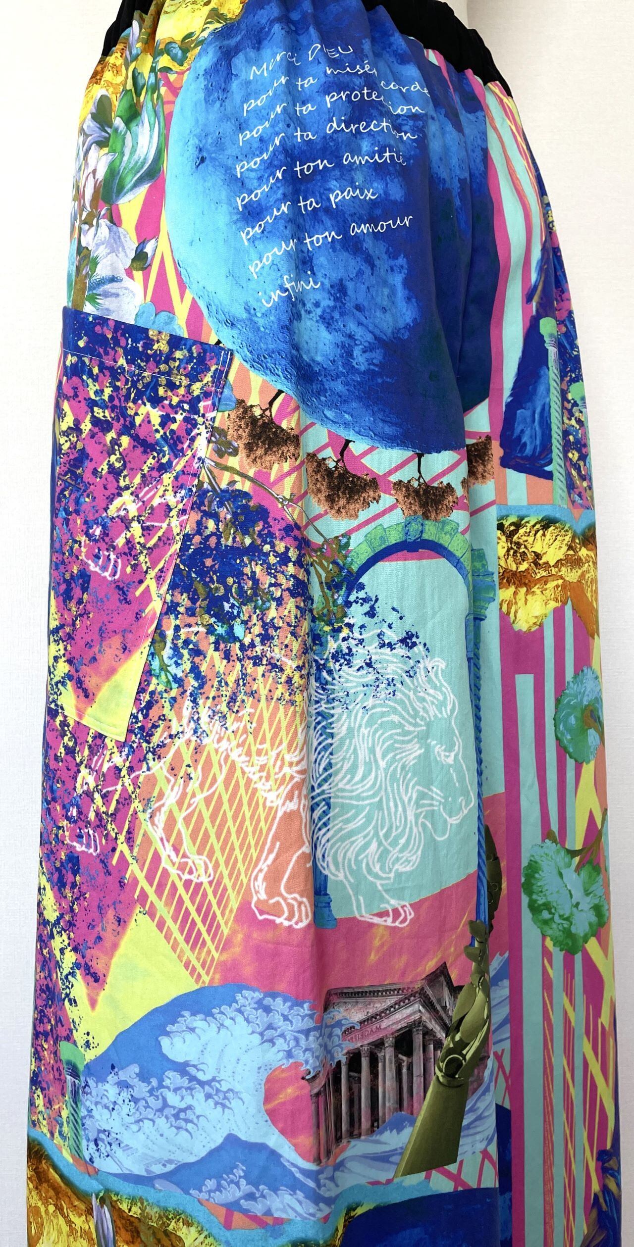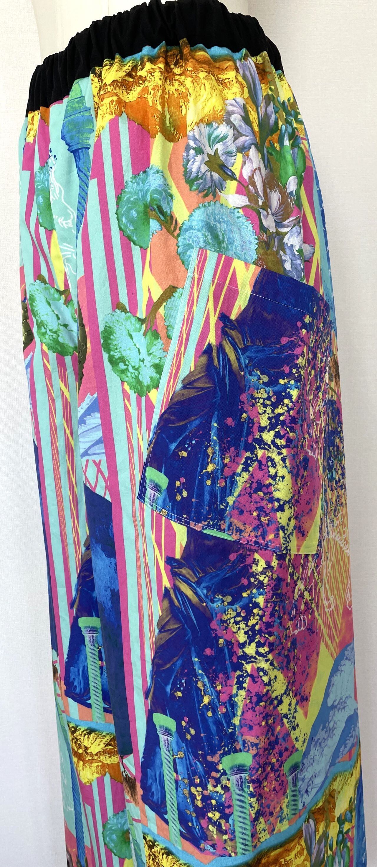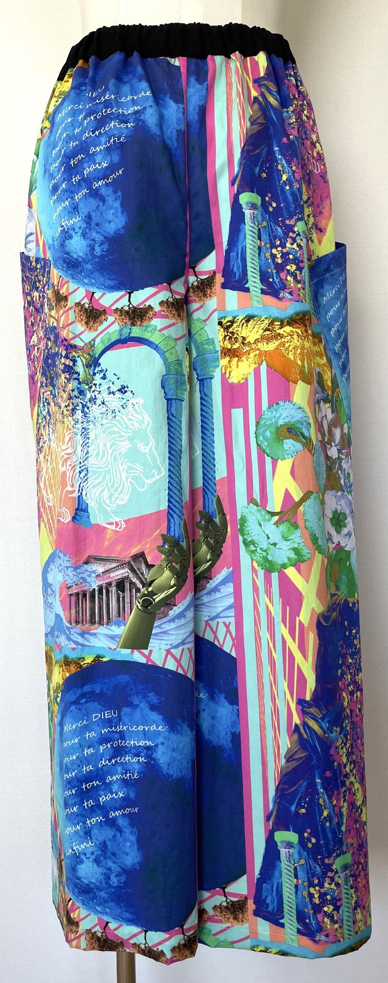 自身で描いたコラージュアートをプリントした生地で、型紙、縫製まですべての工程をデザイナー自身が行いました。
