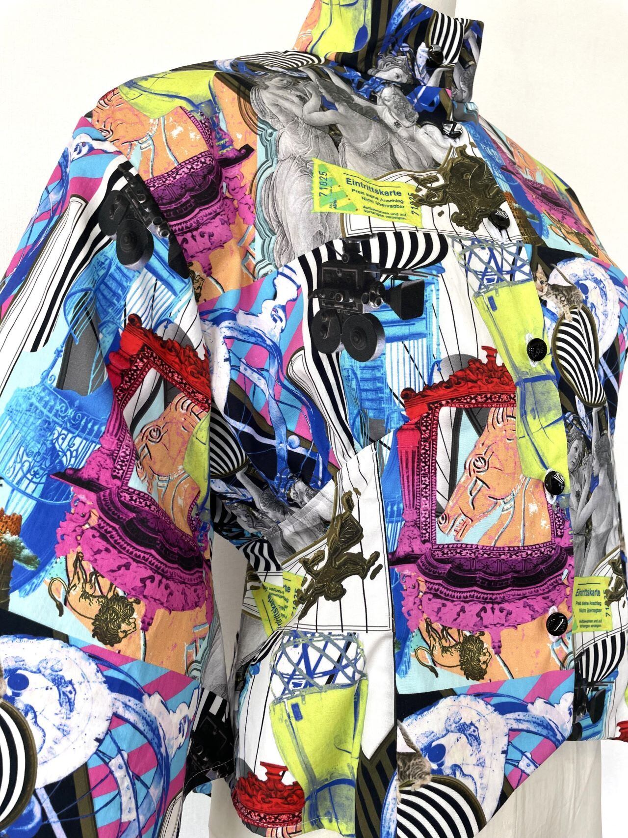 オリジナルのコラージュアートをプリントした生地で、型紙、縫製まですべての工程をデザイナー自身が行った1点物です。