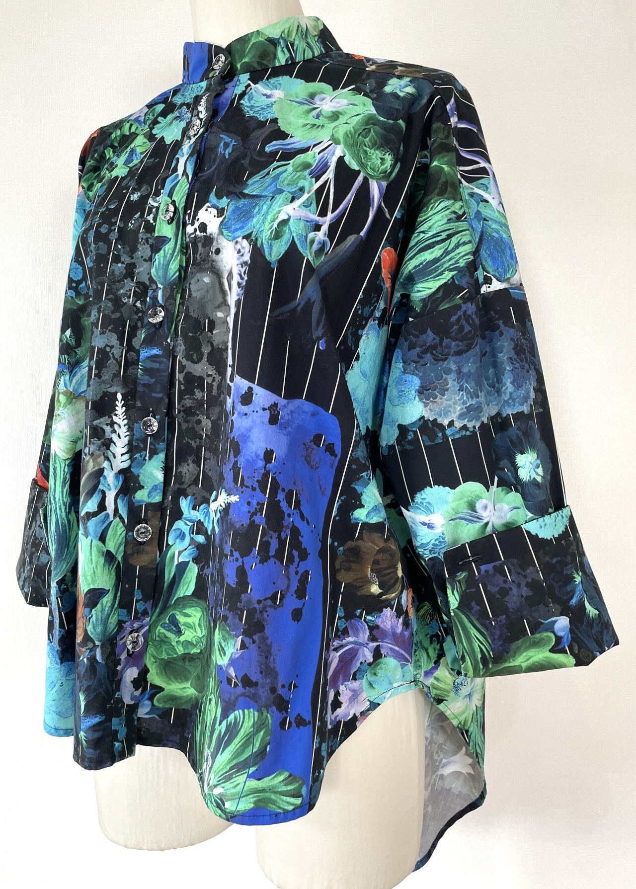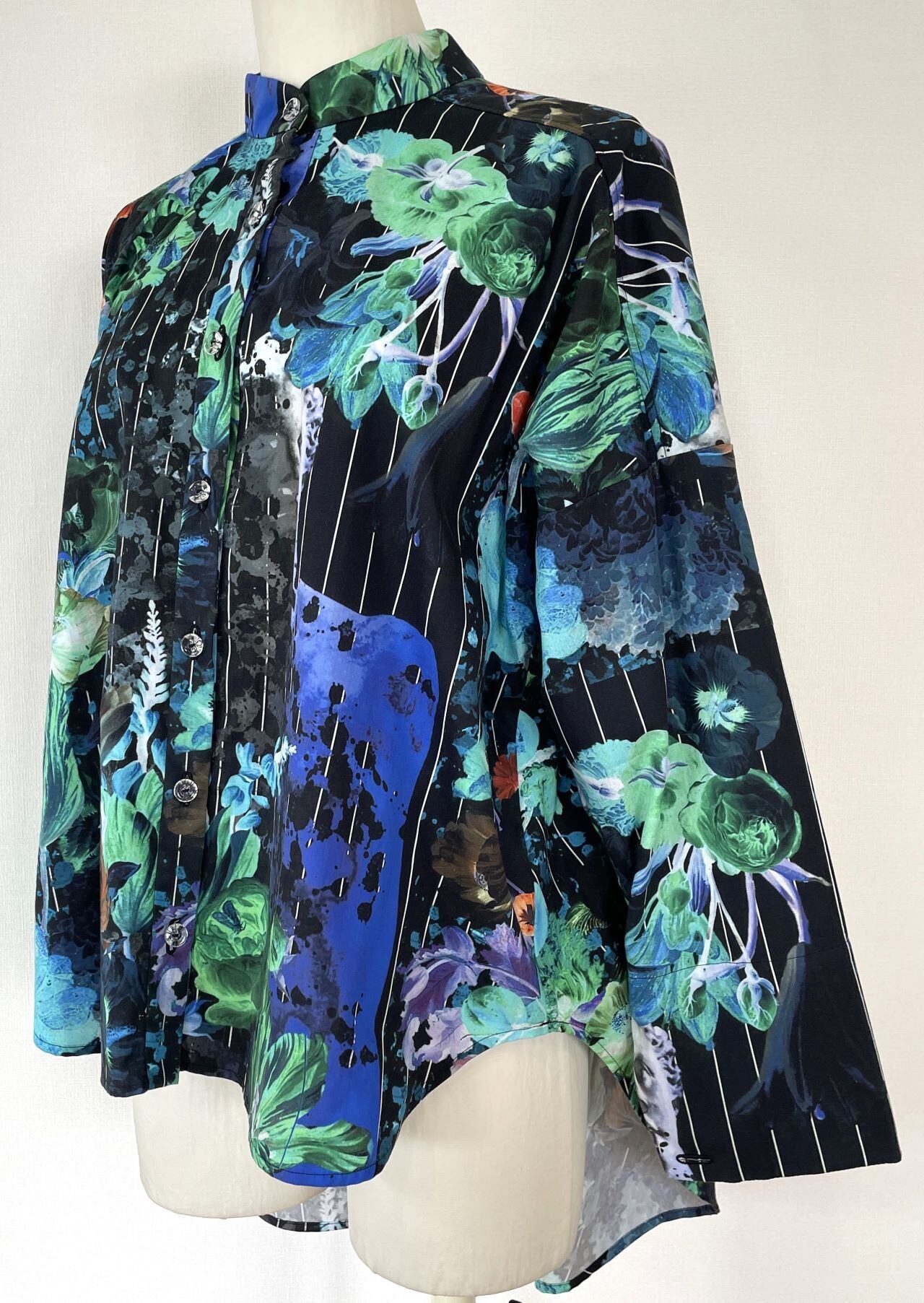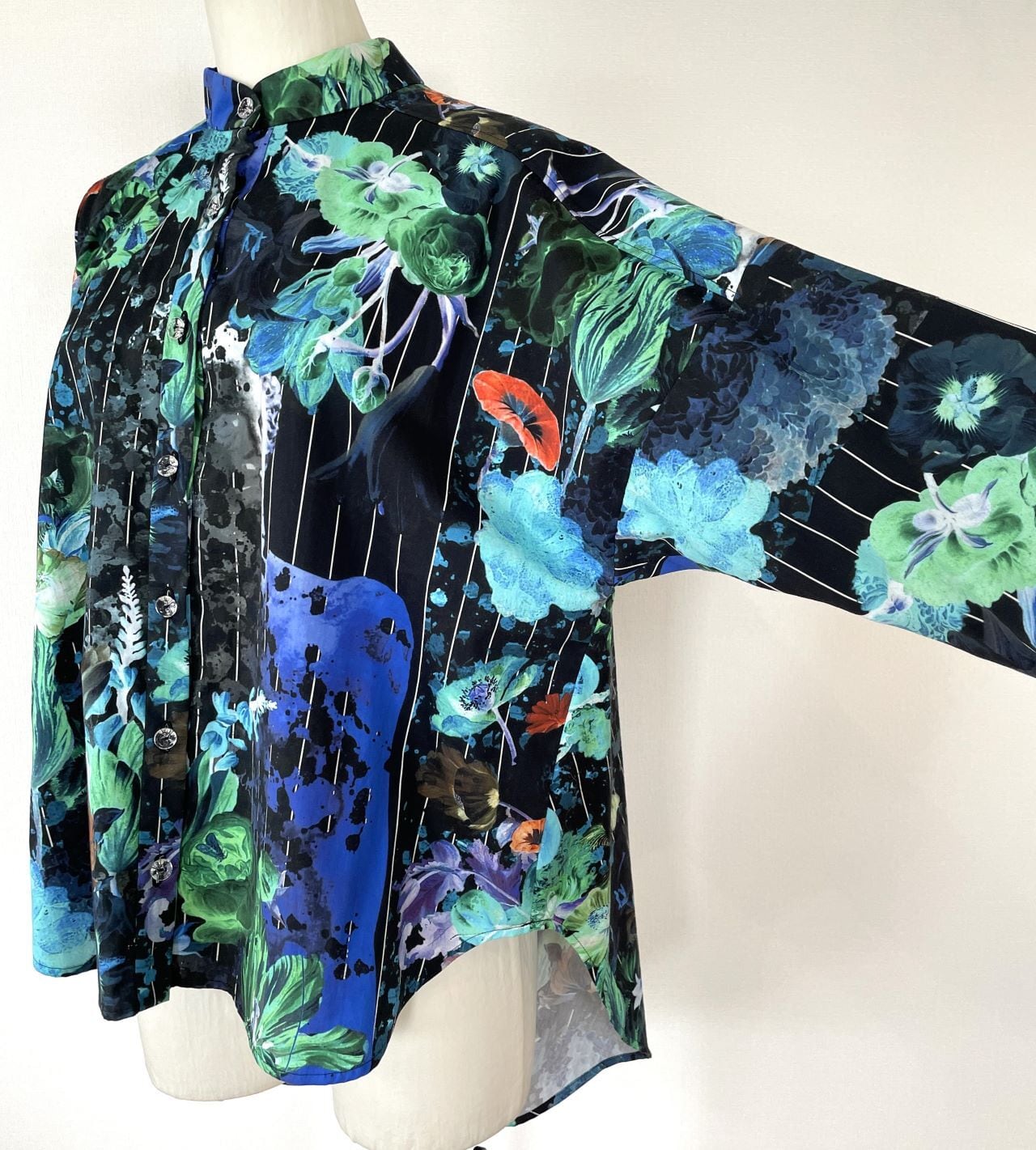 オリジナルのコラージュアートをプリントした生地で、型紙、縫製まですべての工程をデザイナー自身が行ったオリジナルのシャツです。