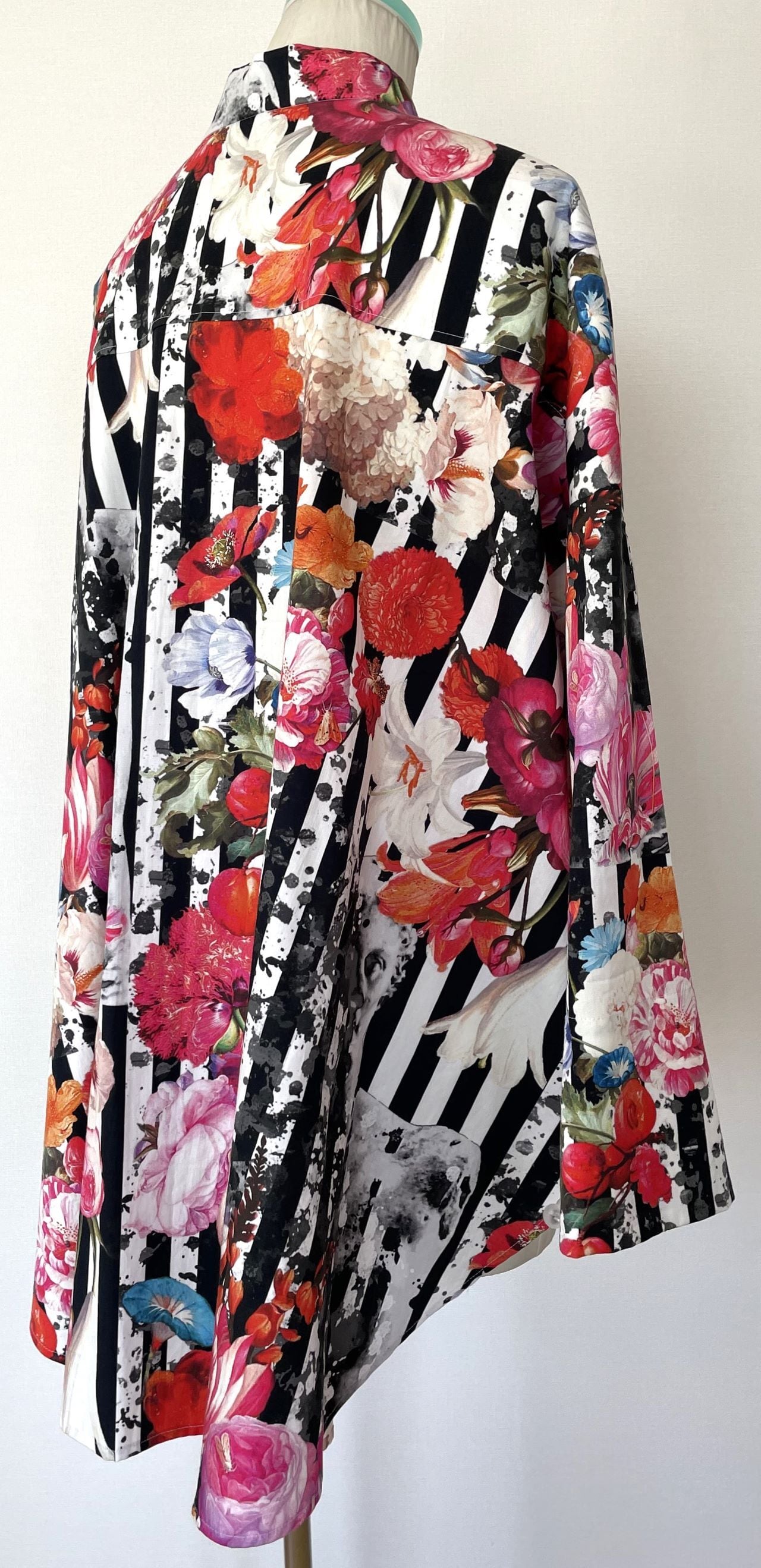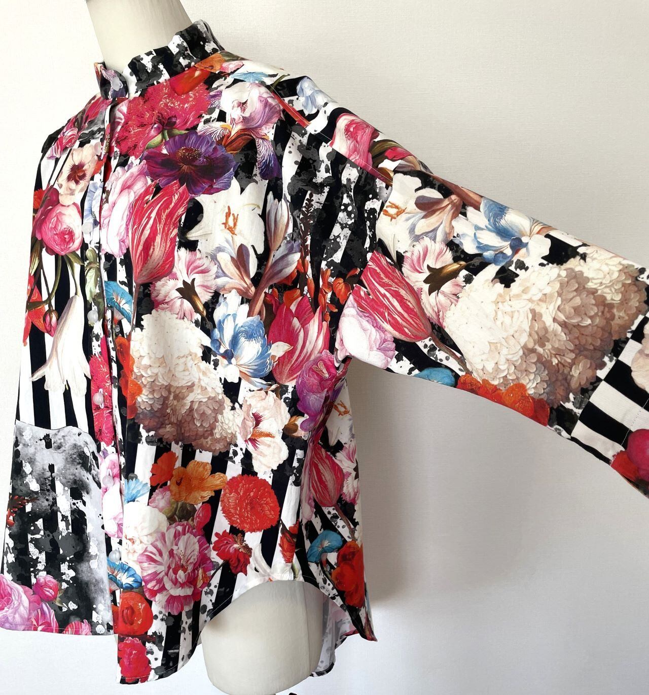 オリジナルのコラージュアートをプリントした生地で、型紙、縫製まですべての工程をデザイナー自身が行ったオリジナルのシャツです。