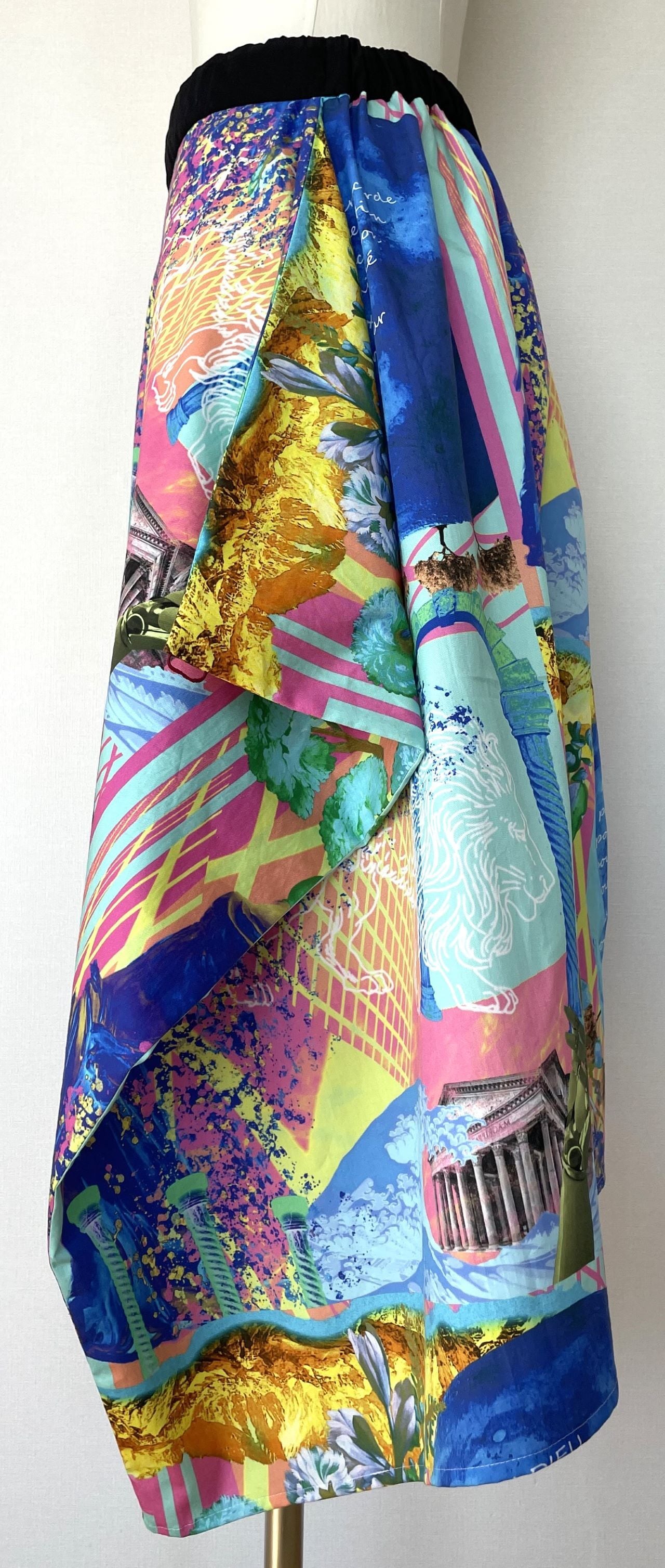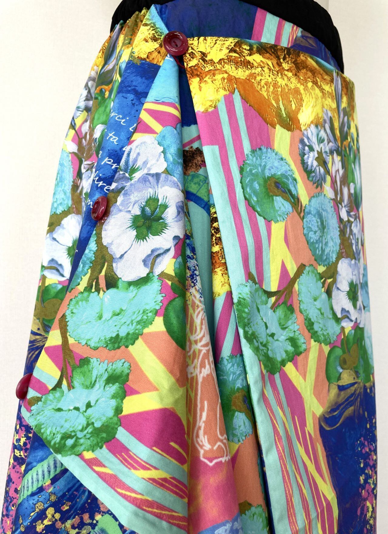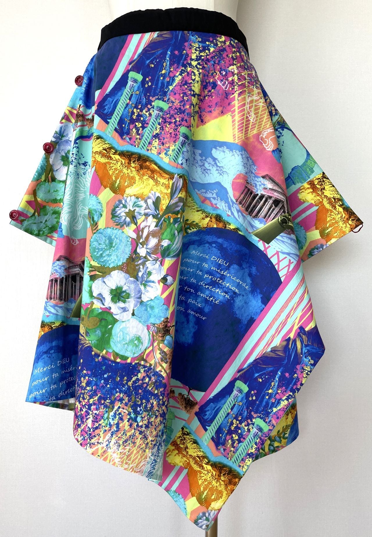 オリジナルのデジタルアートをプリントした生地で、デザイン、型紙、縫製まですべての工程をデザイナー自身が行いました。