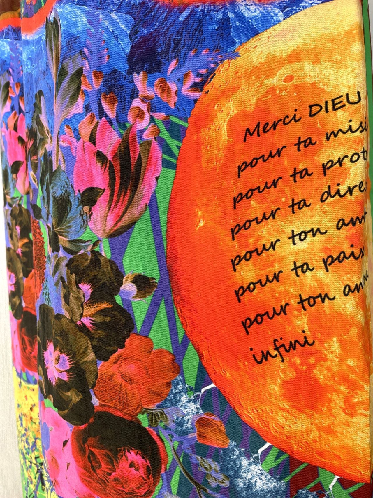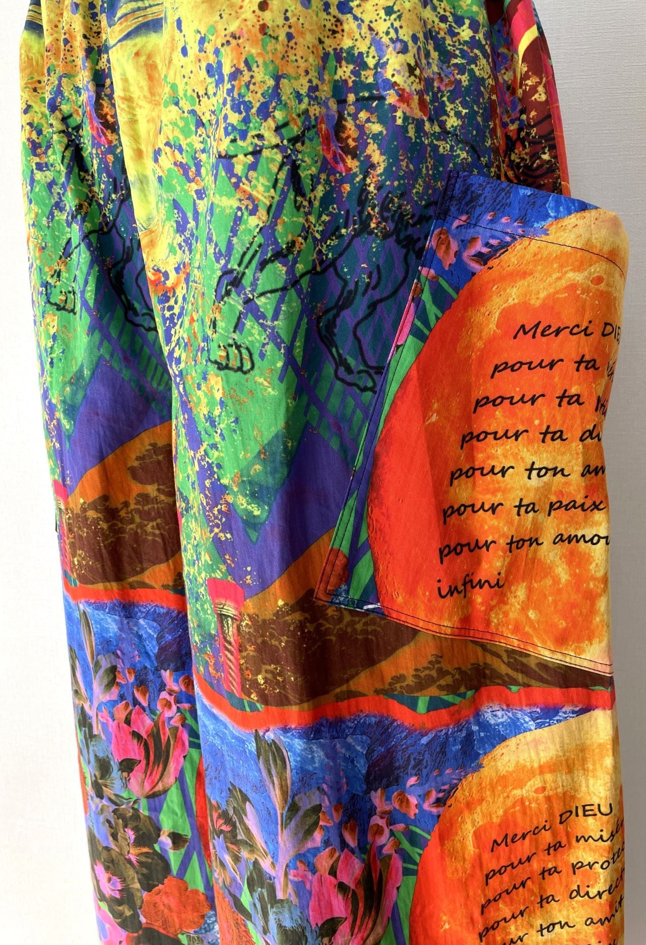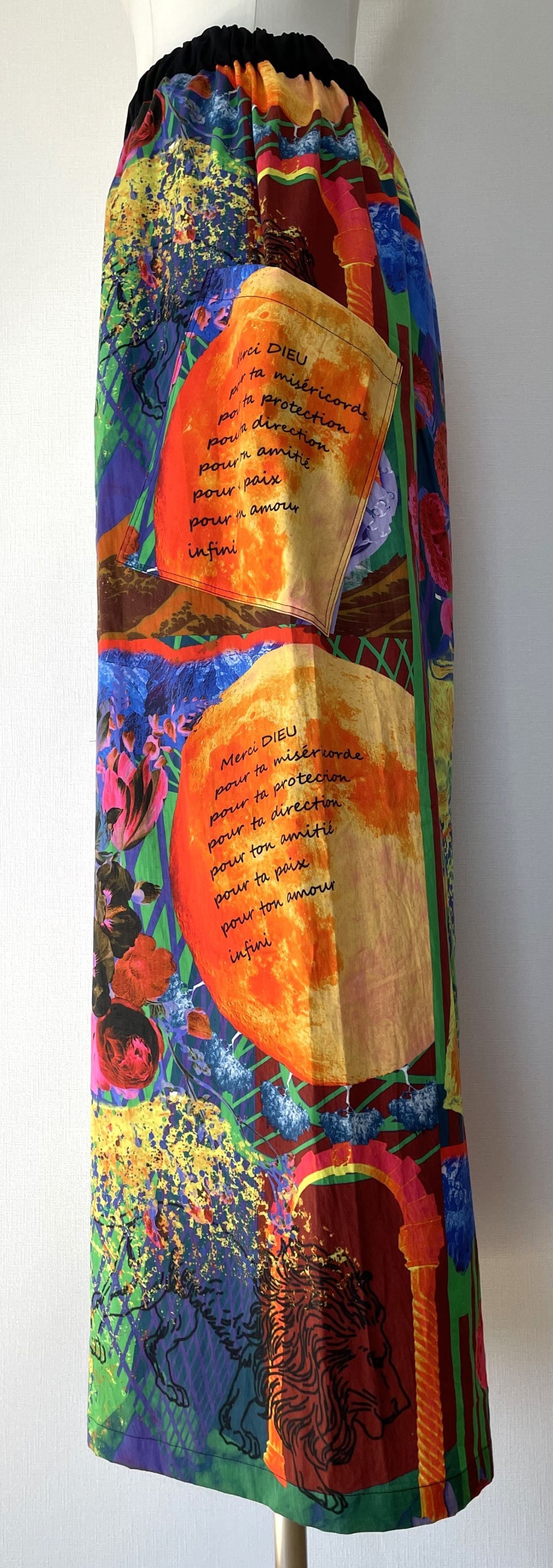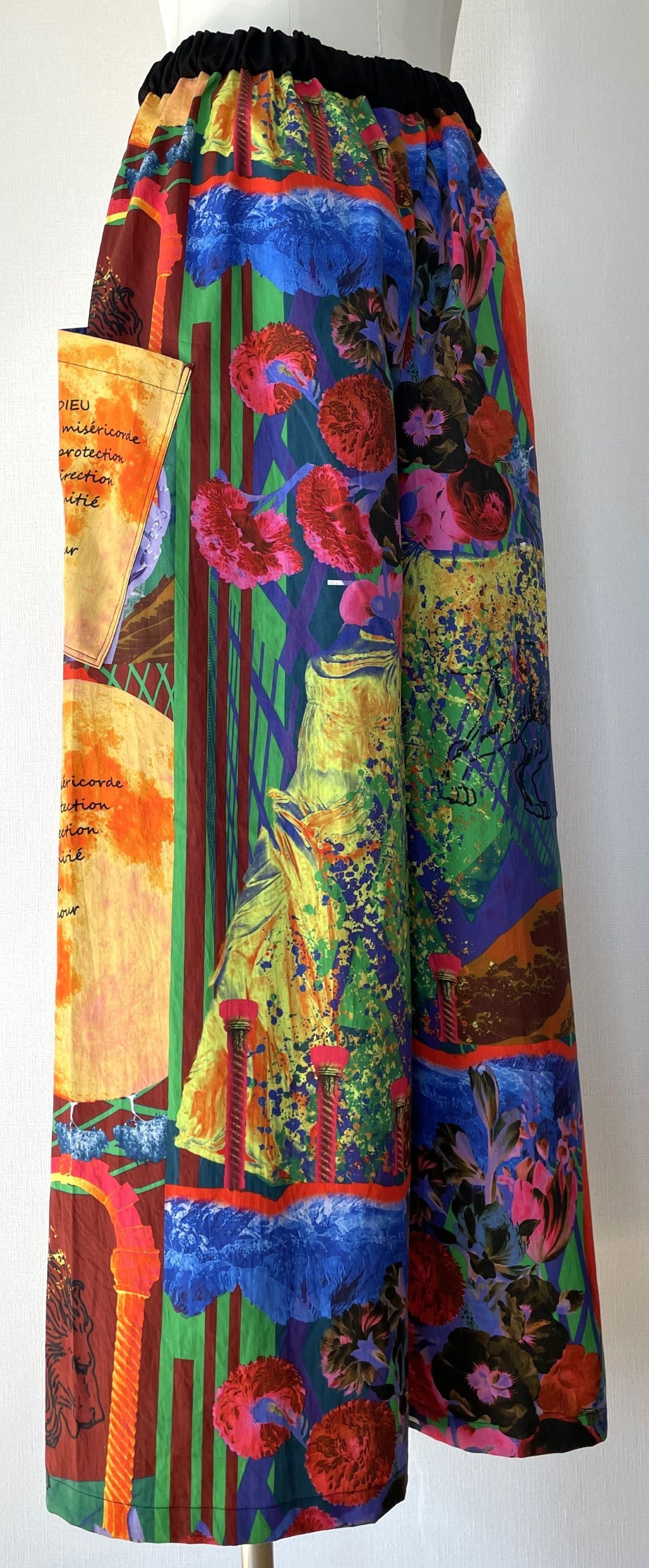 自身で描いたコラージュアートをプリントした生地で、型紙、縫製まですべての工程をデザイナー自身が行いました。