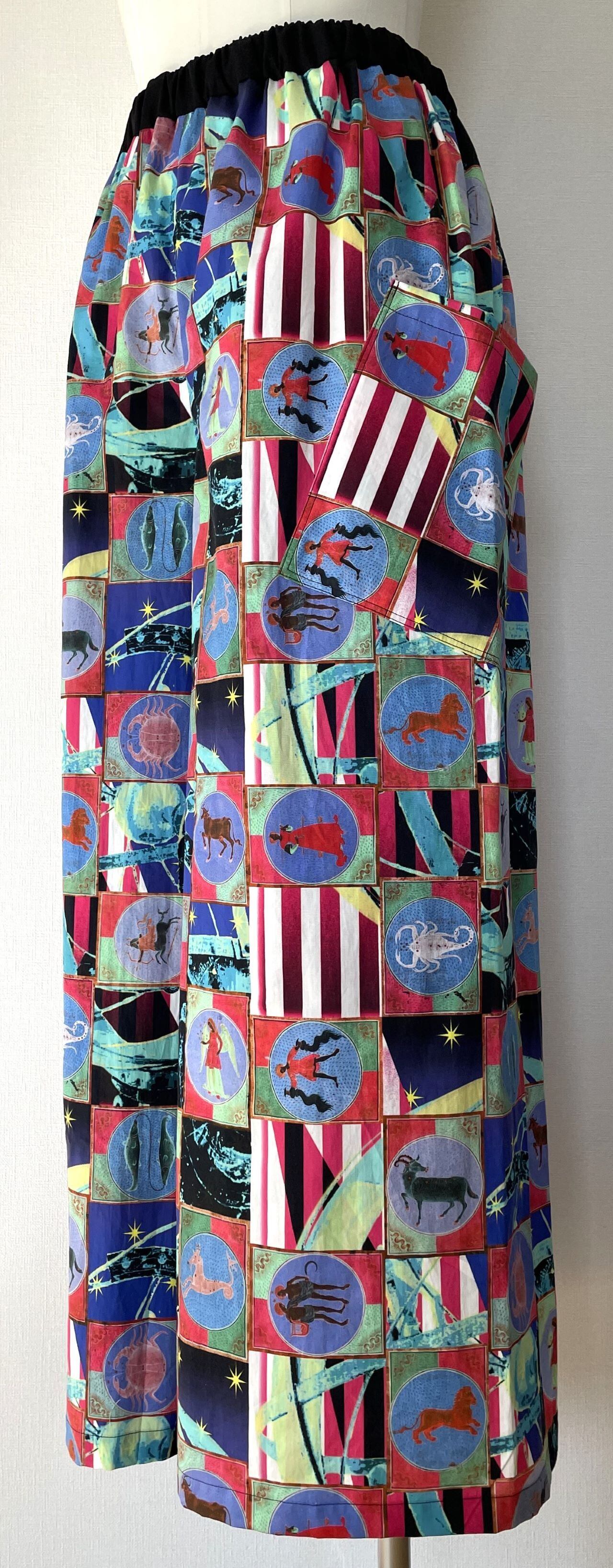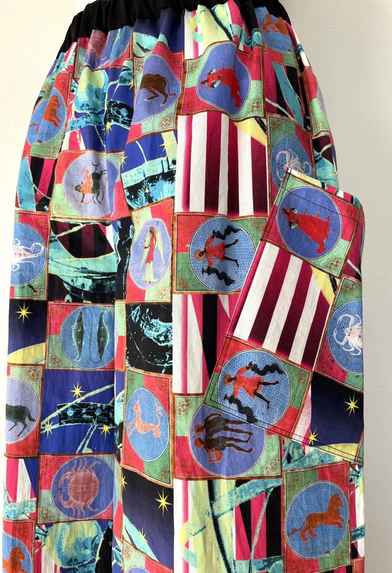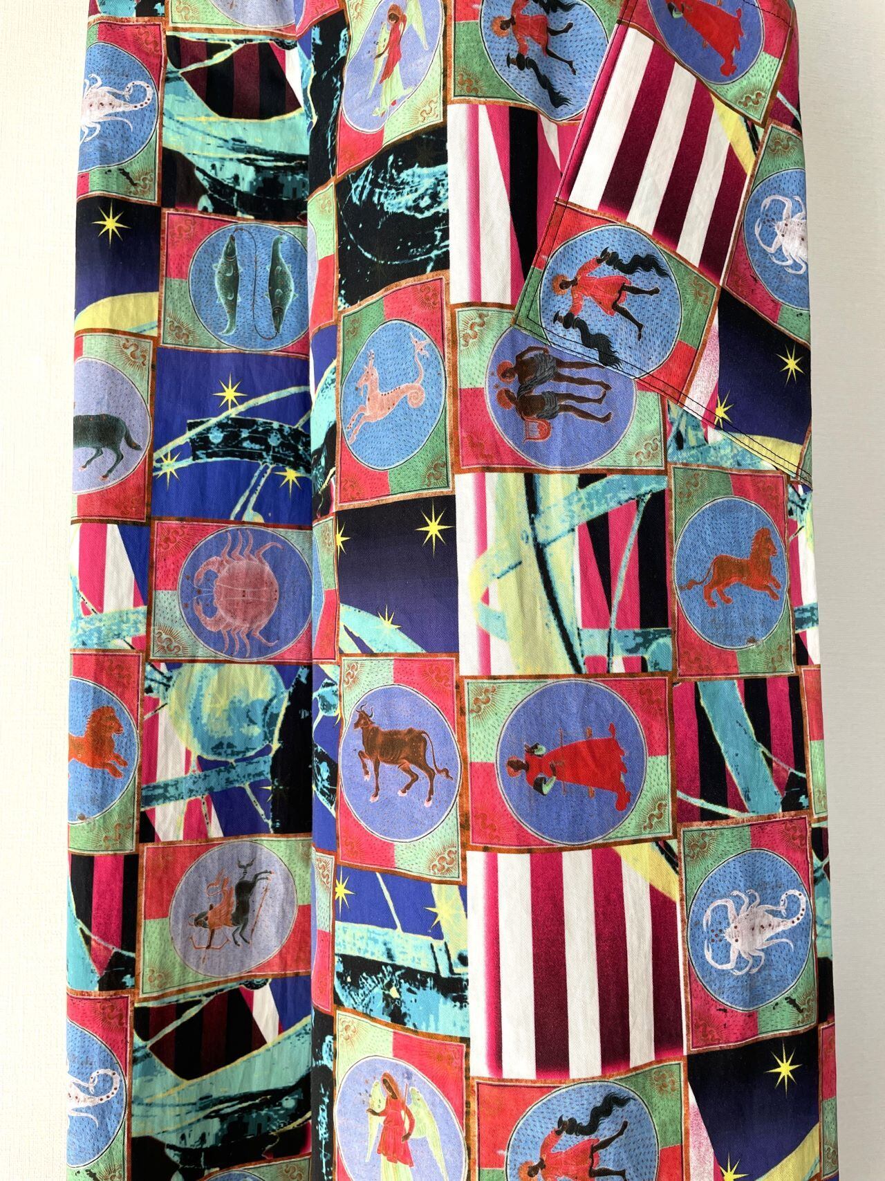 自身で描いたコラージュアートをプリントした生地で、型紙、縫製まですべての工程をデザイナー自身が行いました。