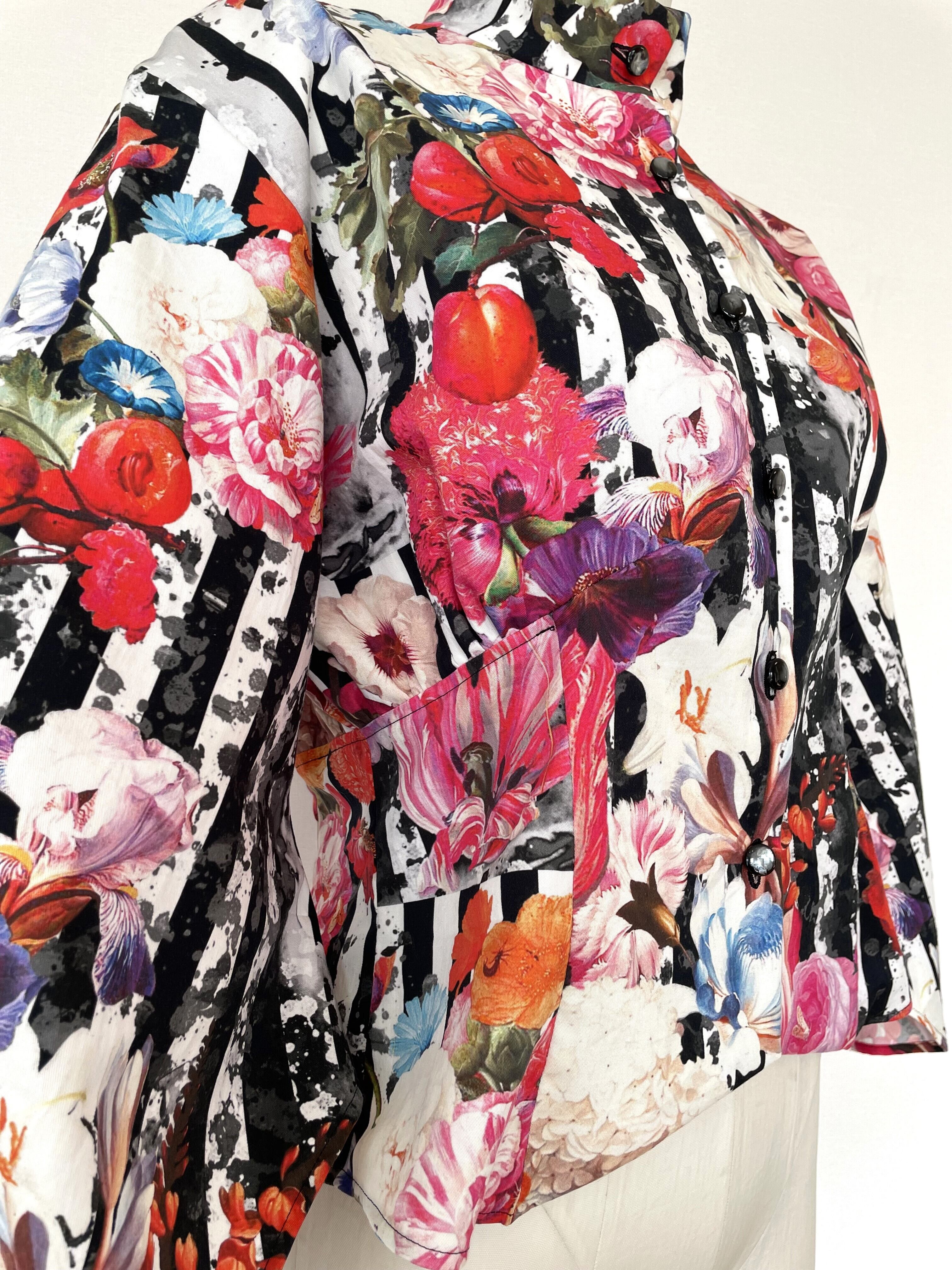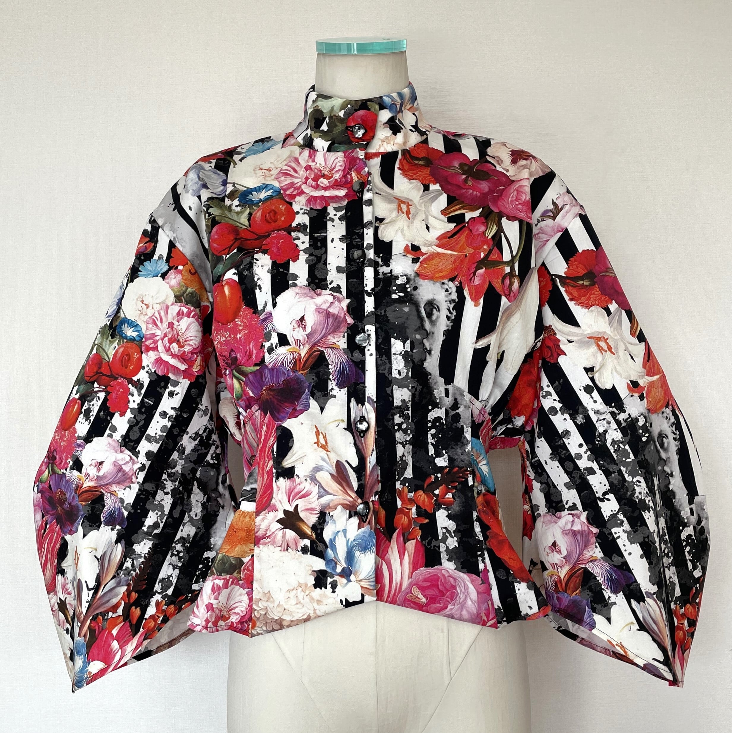 オリジナルのコラージュアートをプリントした生地で、型紙、縫製まですべての工程をデザイナー自身が行った1点物です。