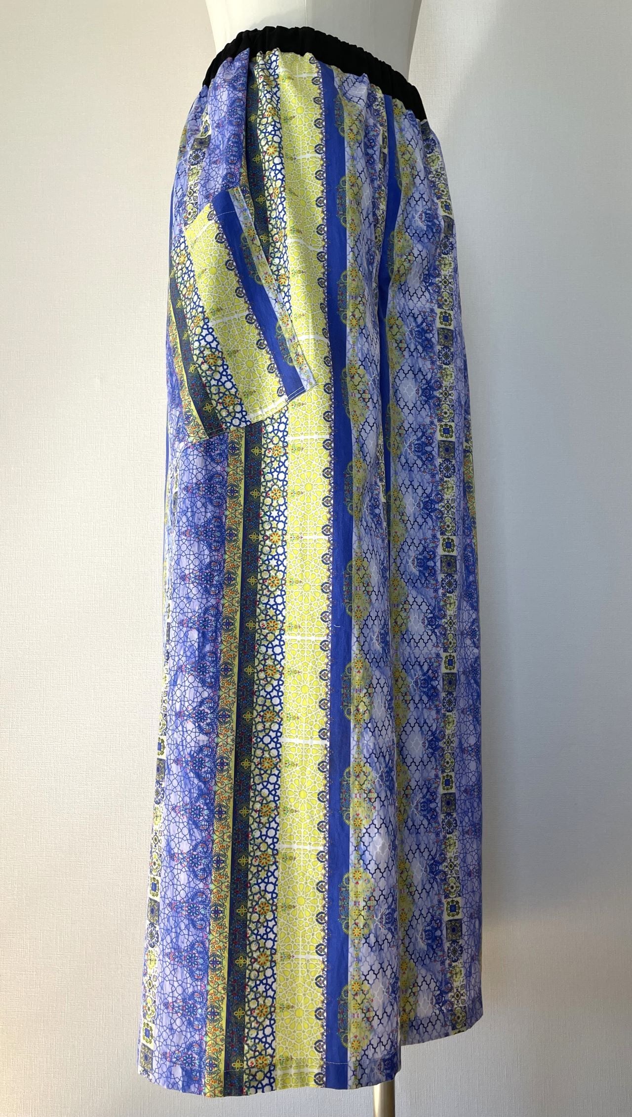 自身で描いたコラージュアートをプリントした生地で、型紙、縫製まですべての工程をデザイナー自身が行いました。