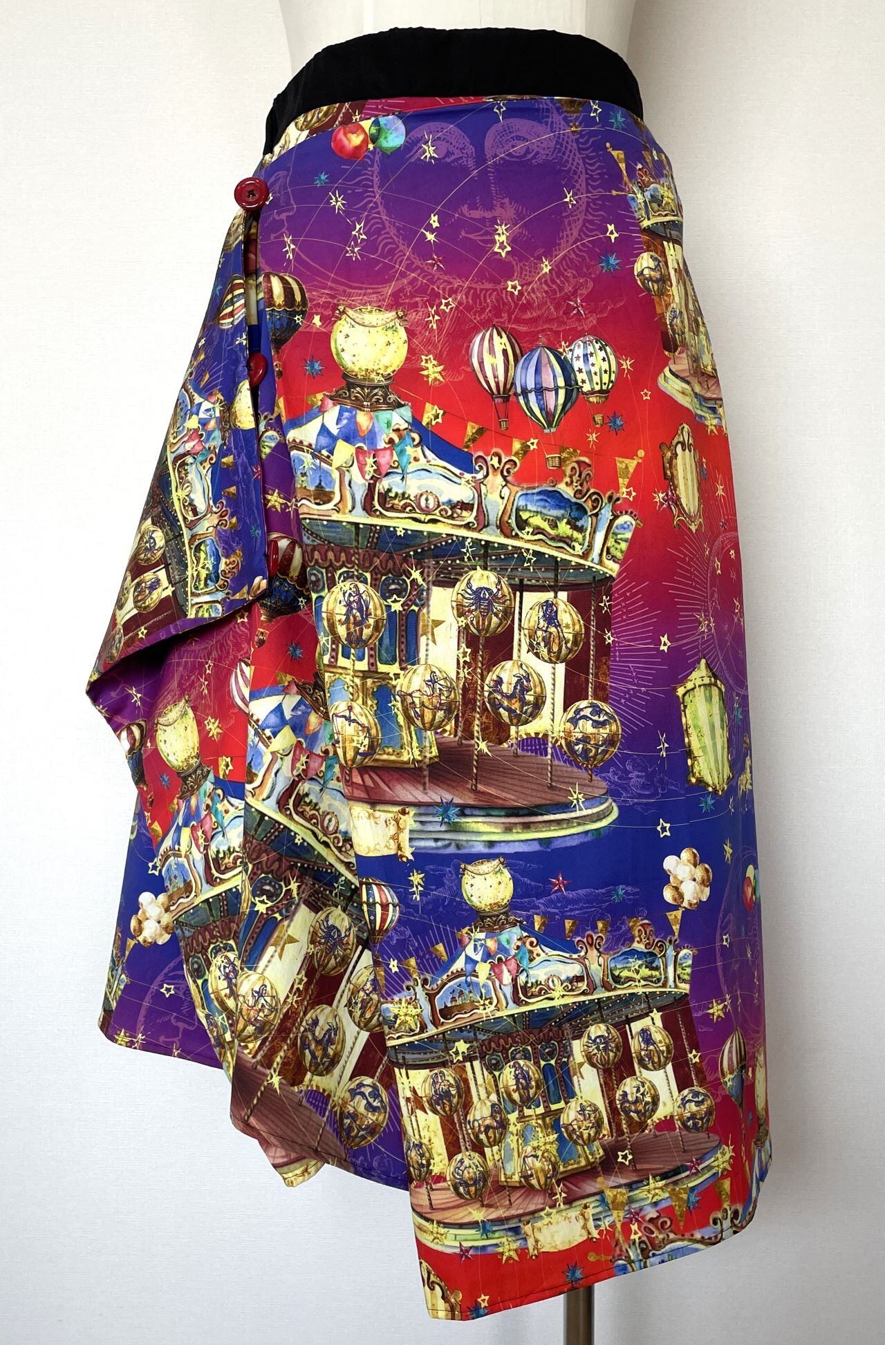 スカート脇にボタンが付いており、両脇をボタン止めすることで、スカートのシルエットを変えて楽しめる変形タイプです。