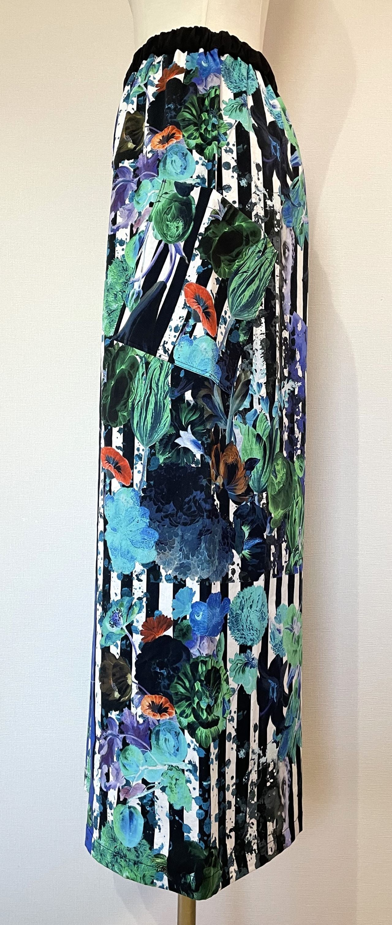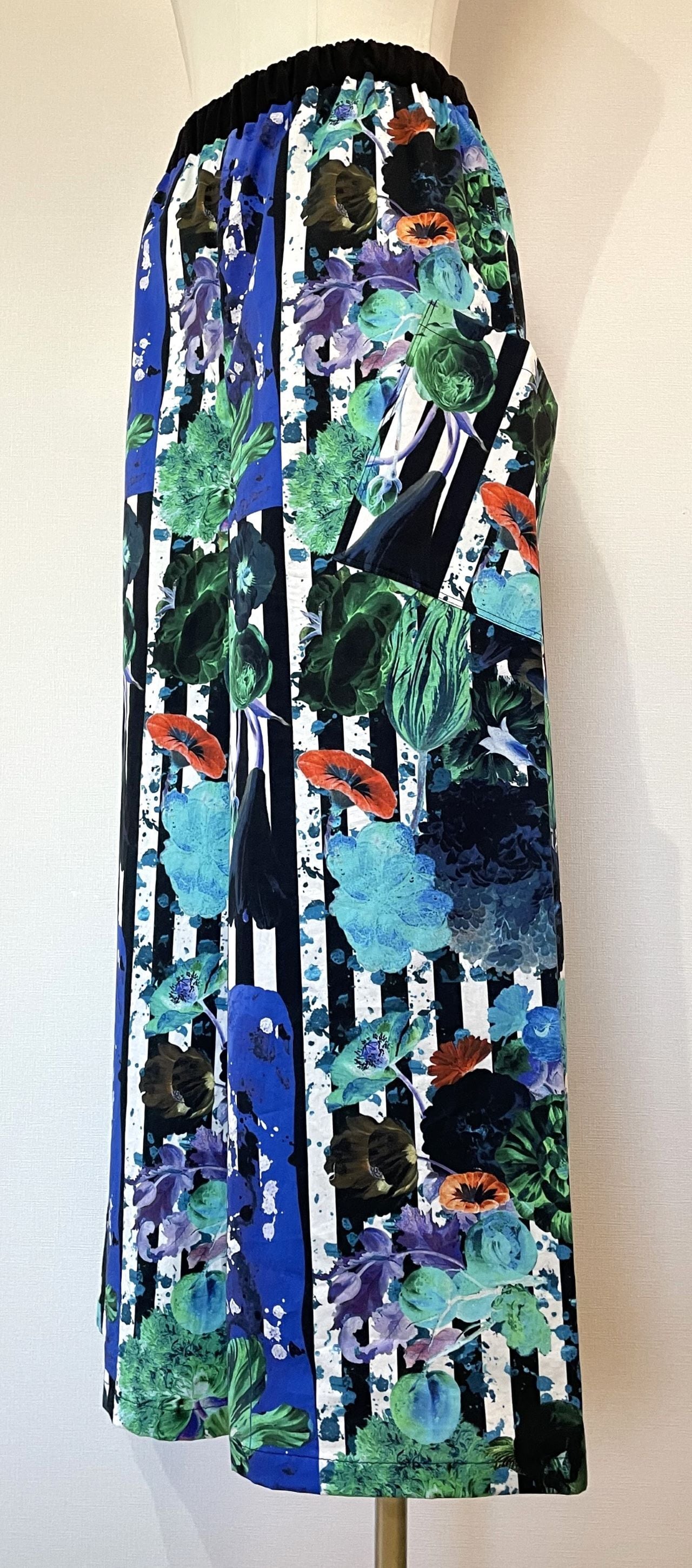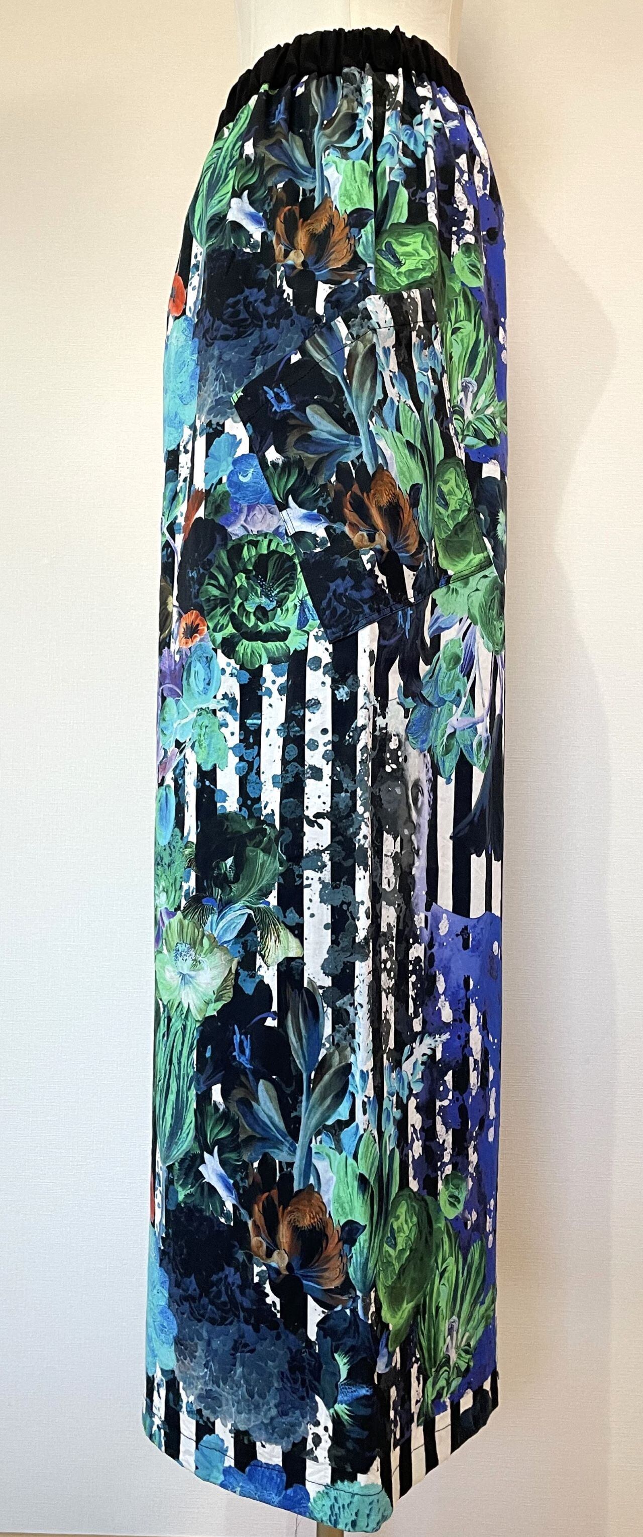 自身で描いたコラージュアートをプリントした生地で、型紙、縫製まですべての工程をデザイナー自身が行いました。