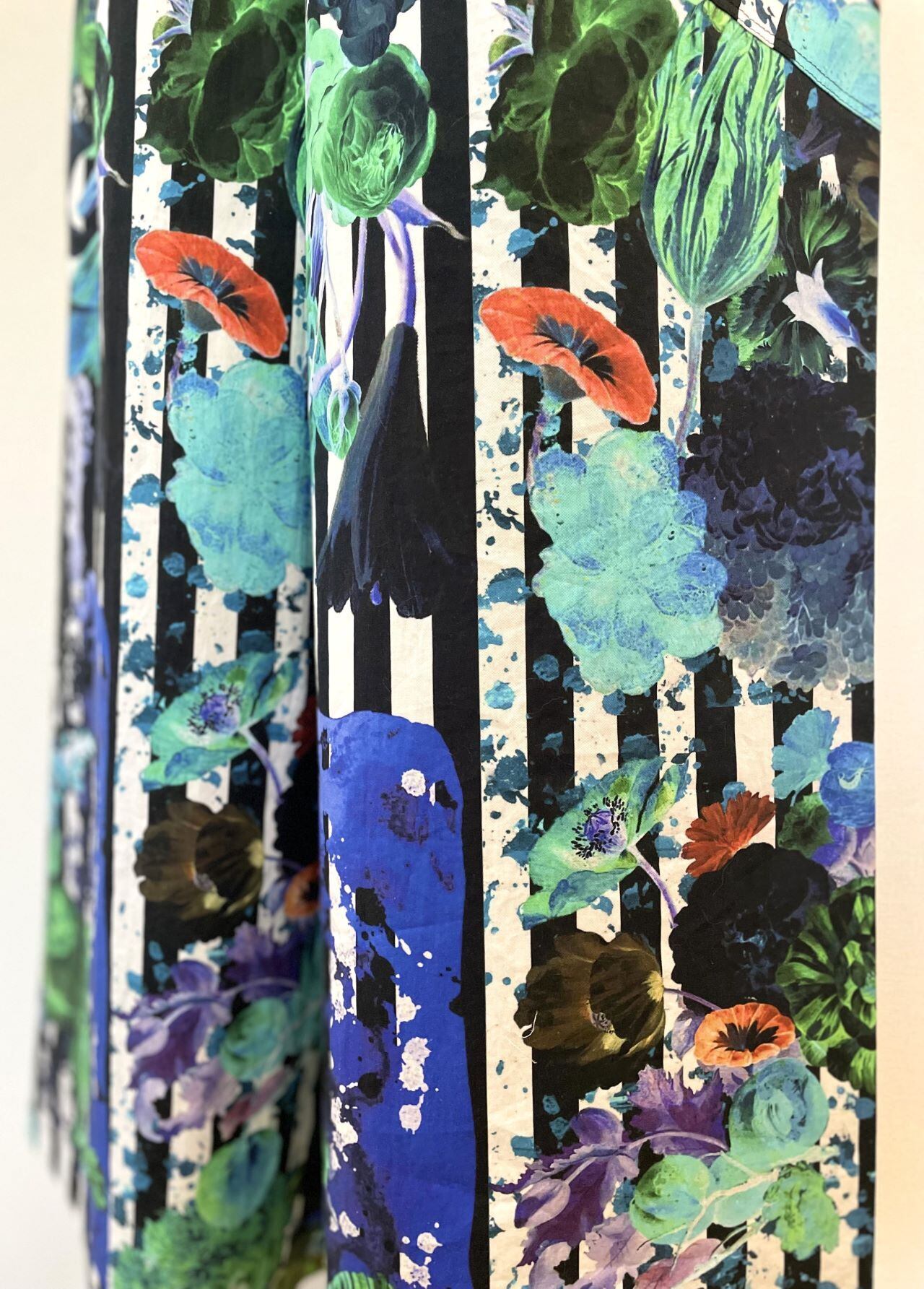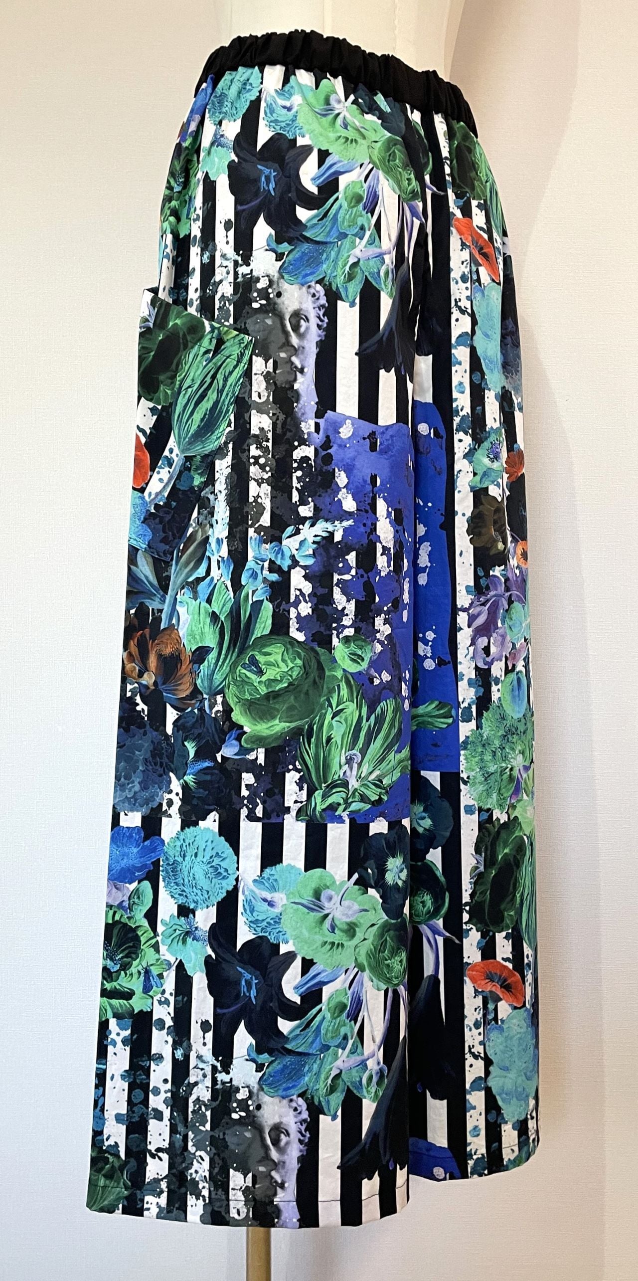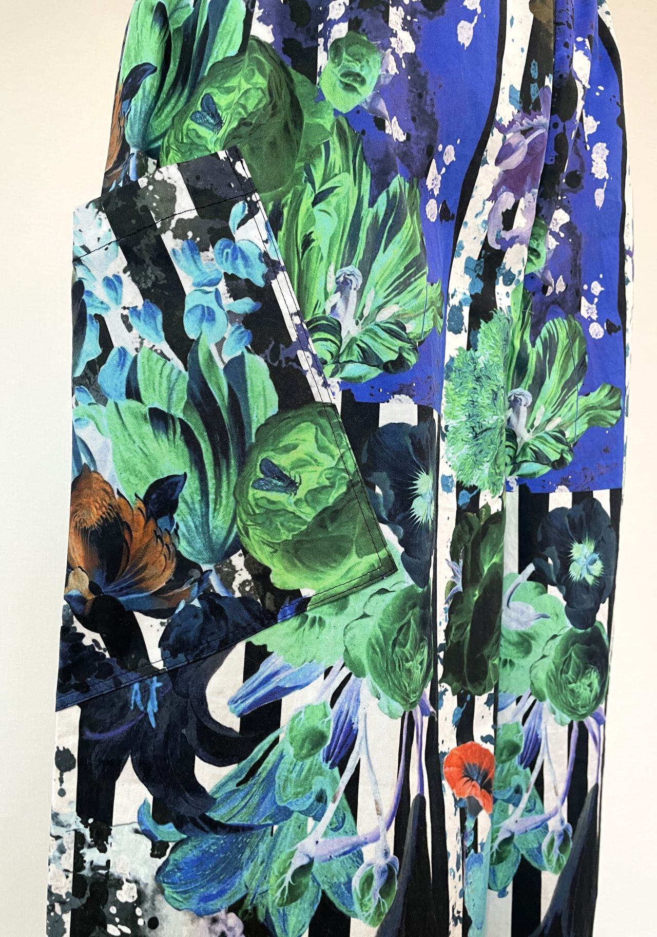 自身で描いたコラージュアートをプリントした生地で、型紙、縫製まですべての工程をデザイナー自身が行いました。