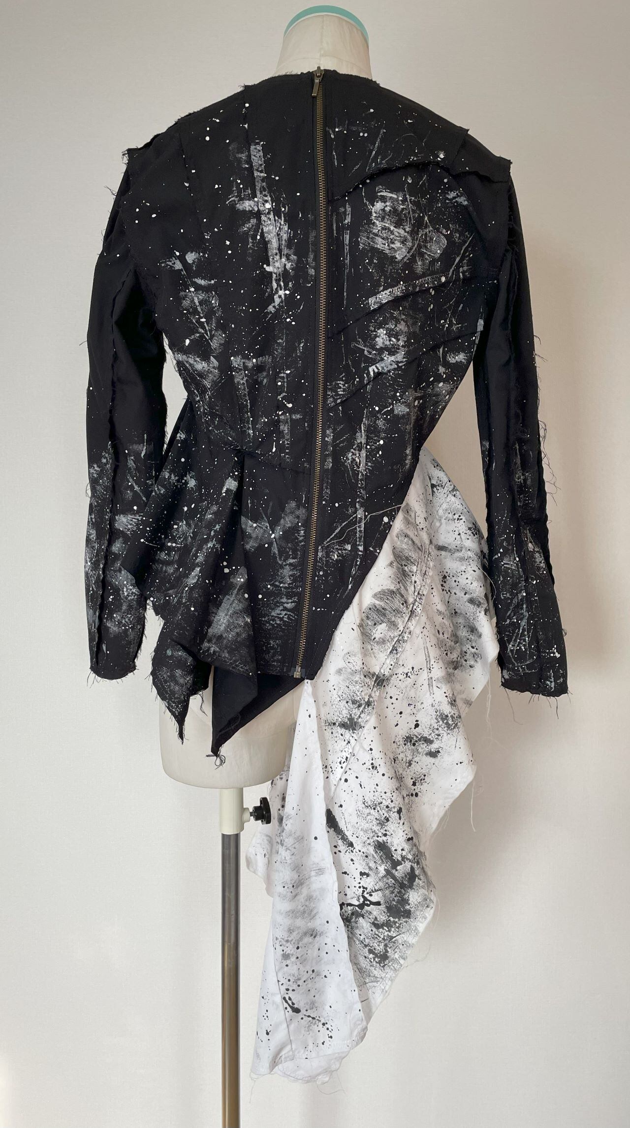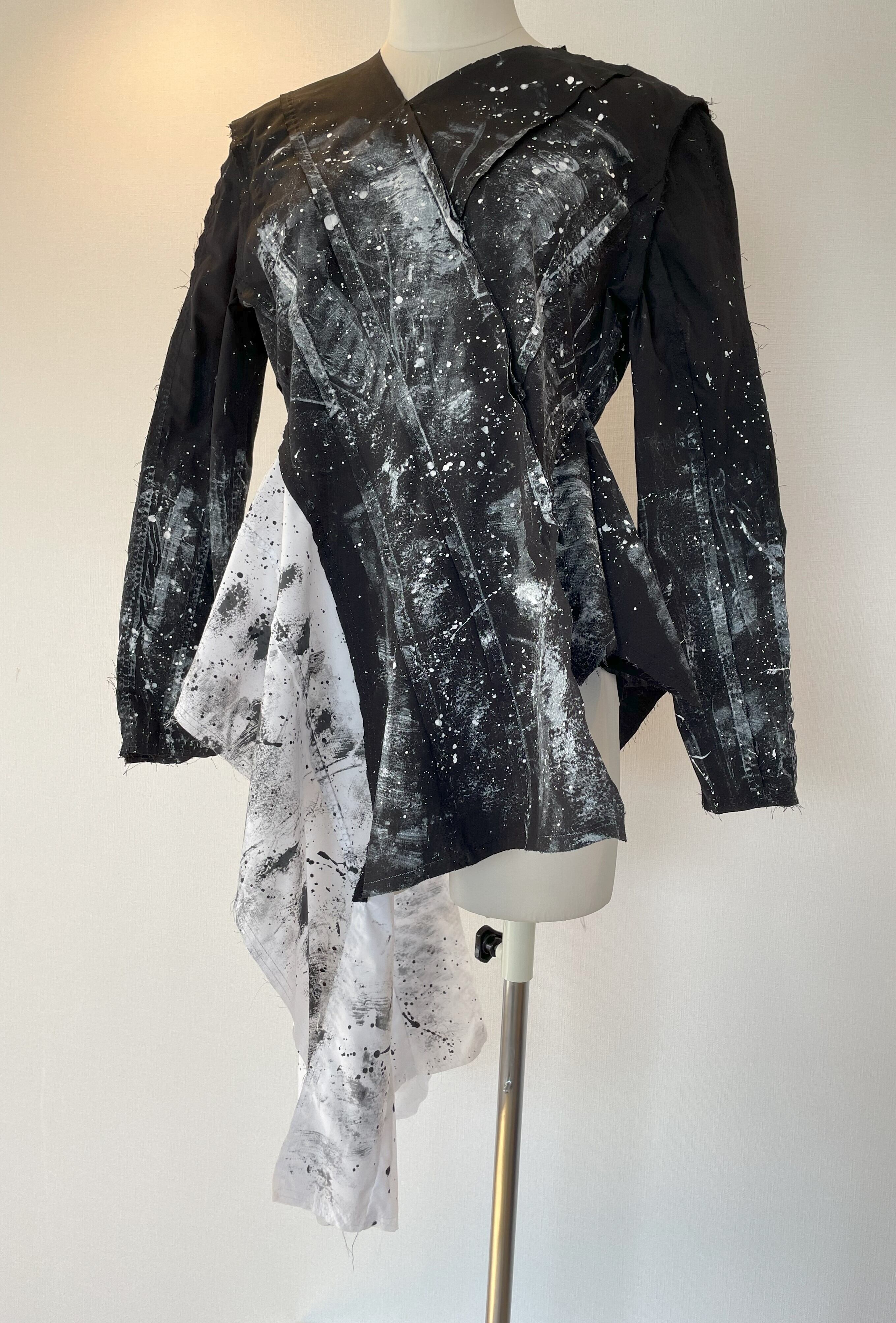 生地用の絵の具を使い、直接生地にペイントしており、デザイン、型紙、縫製まですべての工程を一人で行った1点物です。
