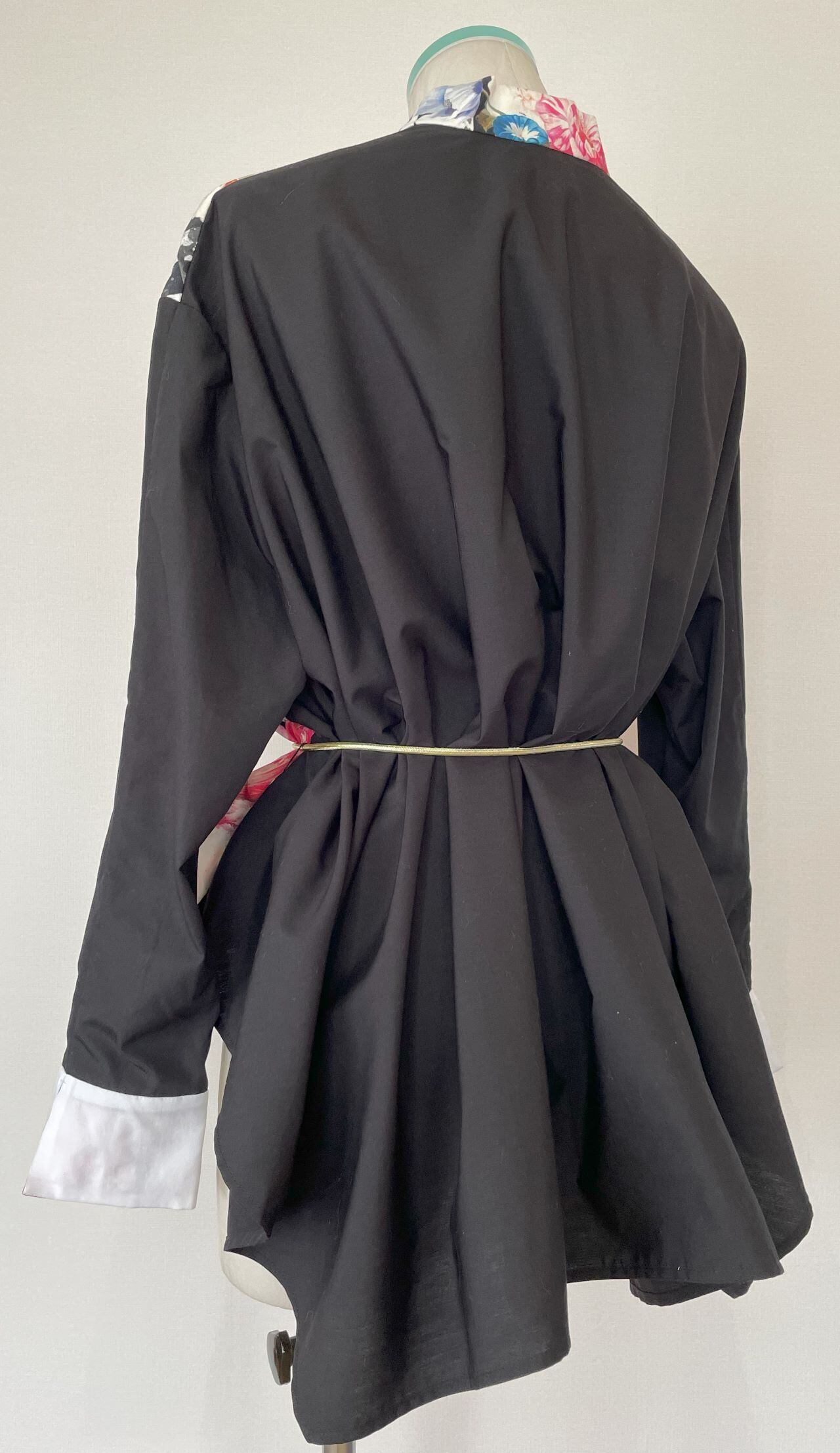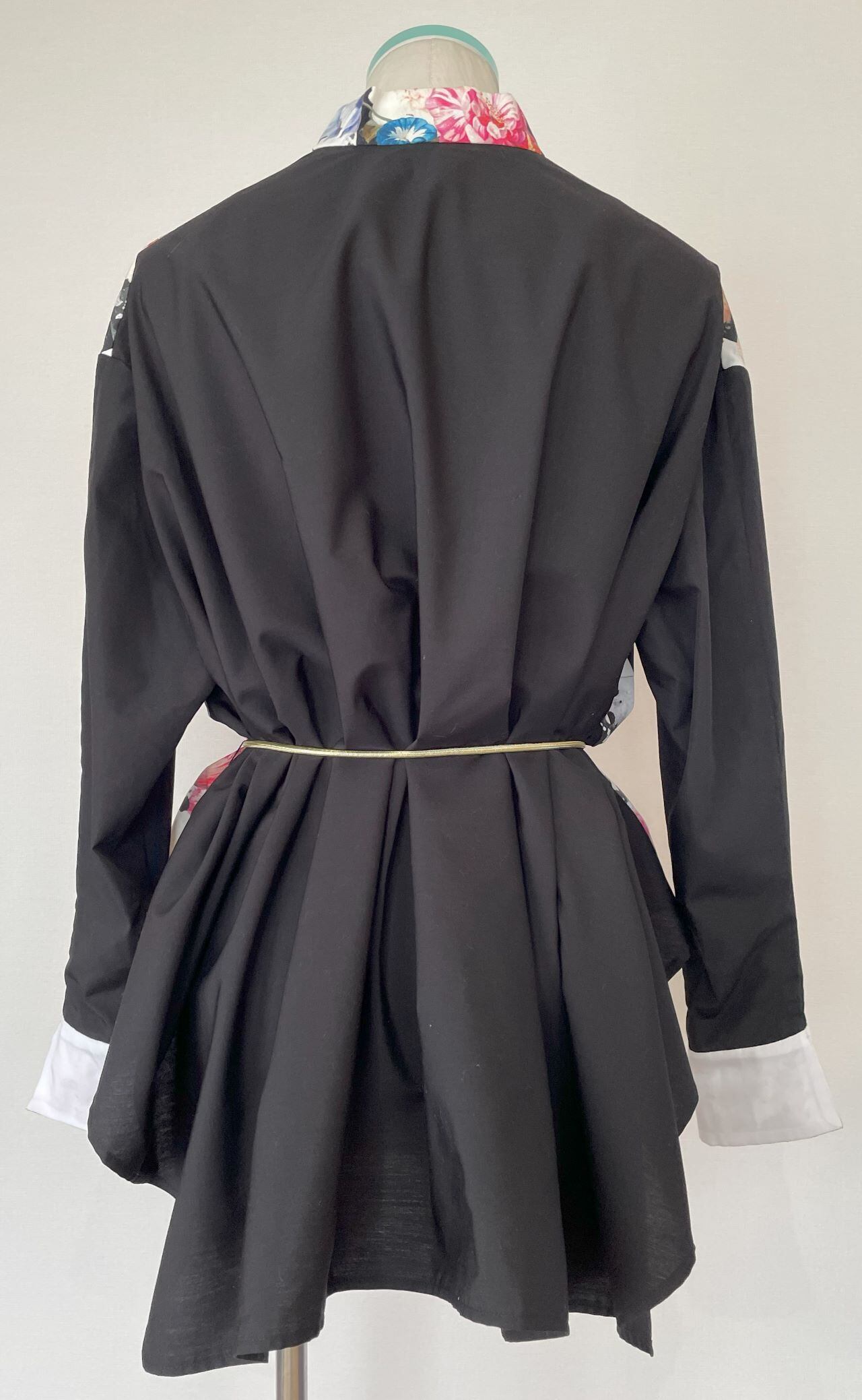 後身頃がマントのように広がった個性的なシルエットのシャツです。