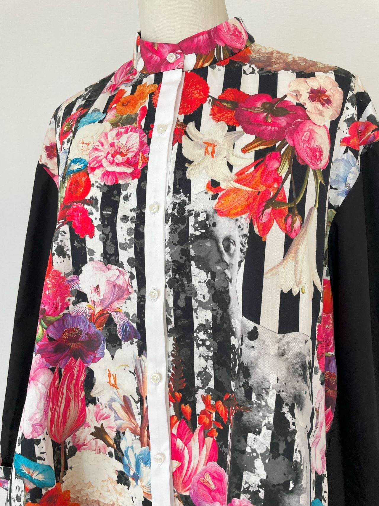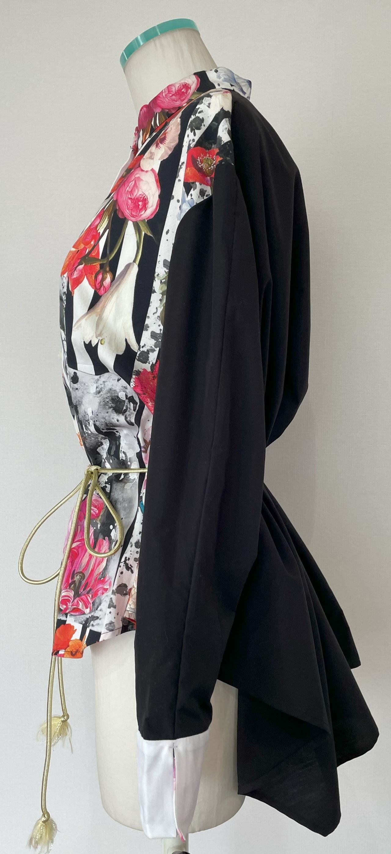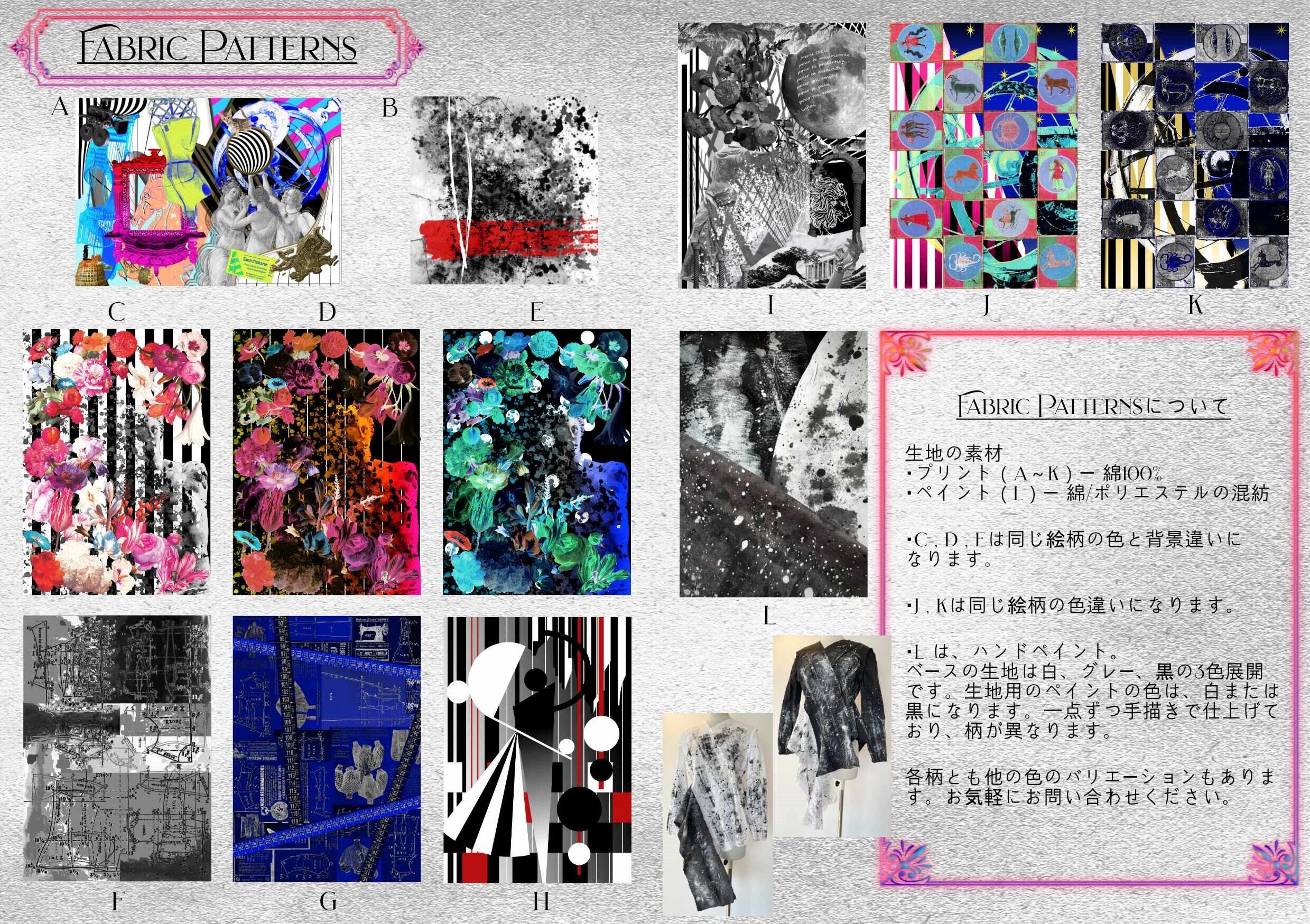 自身で描いたコラージュアートをプリントした生地で、型紙、縫製まですべての工程をデザイナー自身が一人で行いました。
