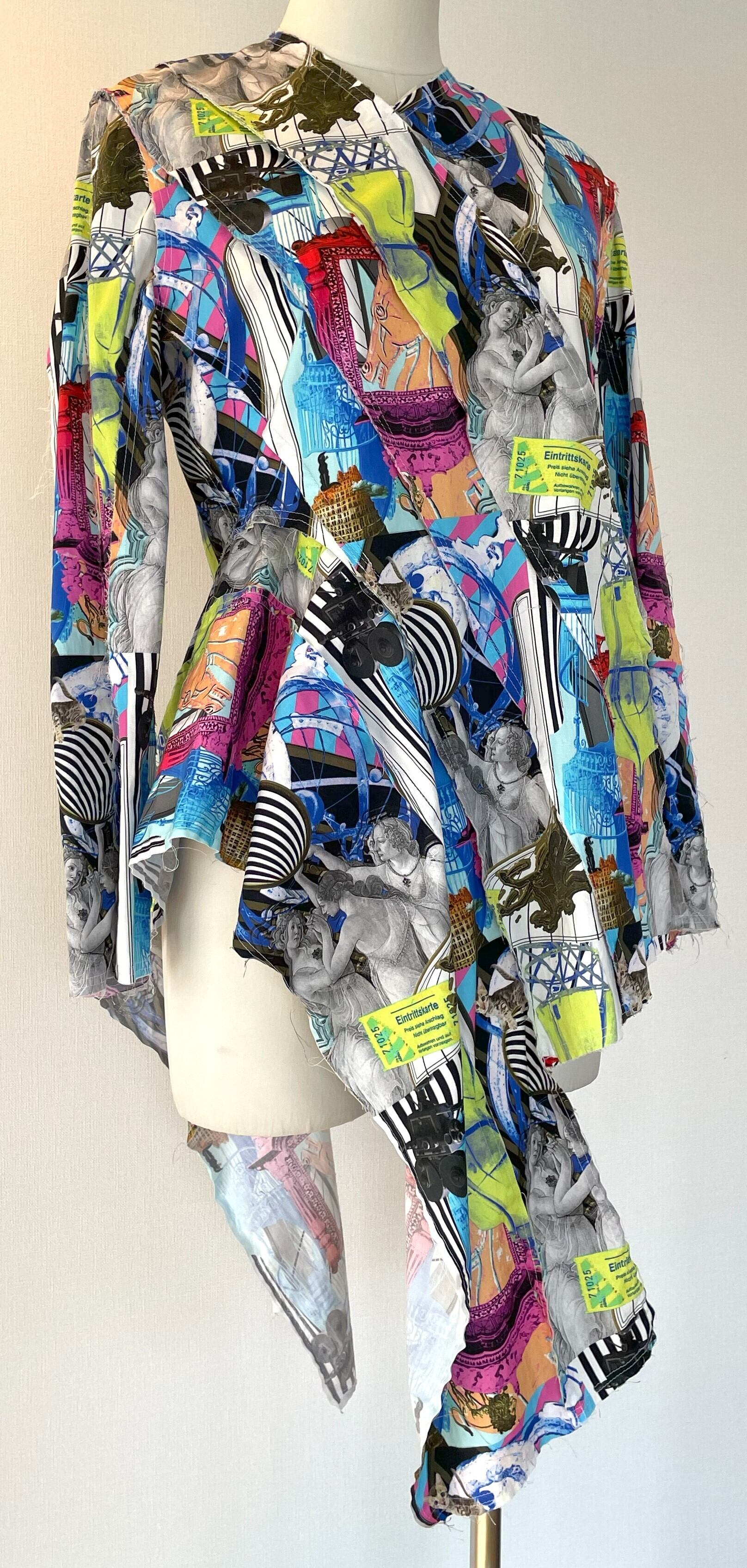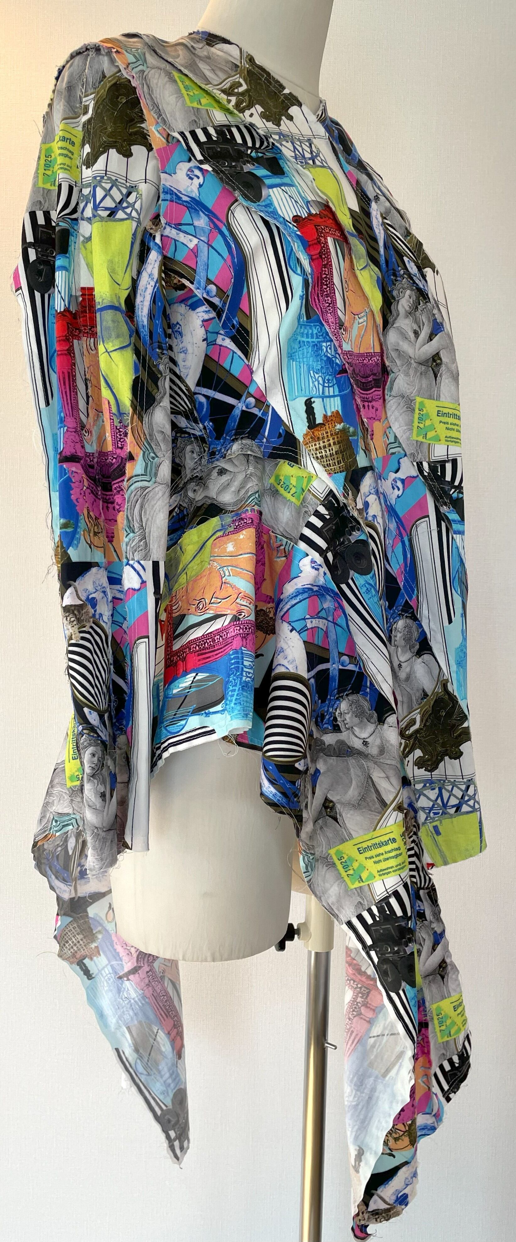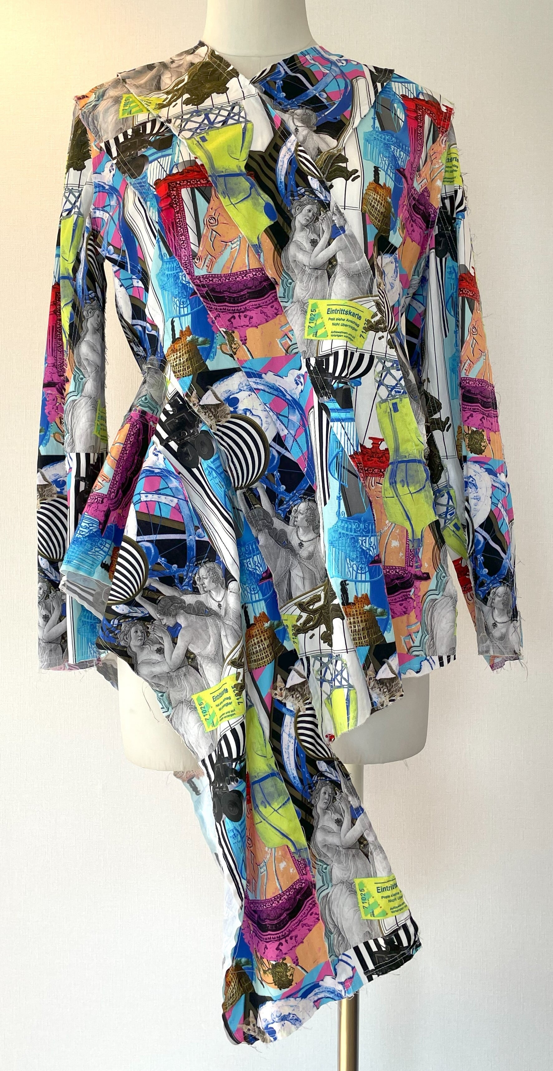 オリジナルのデジタルアートをプリントした生地で、デザイン、型紙、縫製まですべての工程をデザイナー自身が一人で行いました。