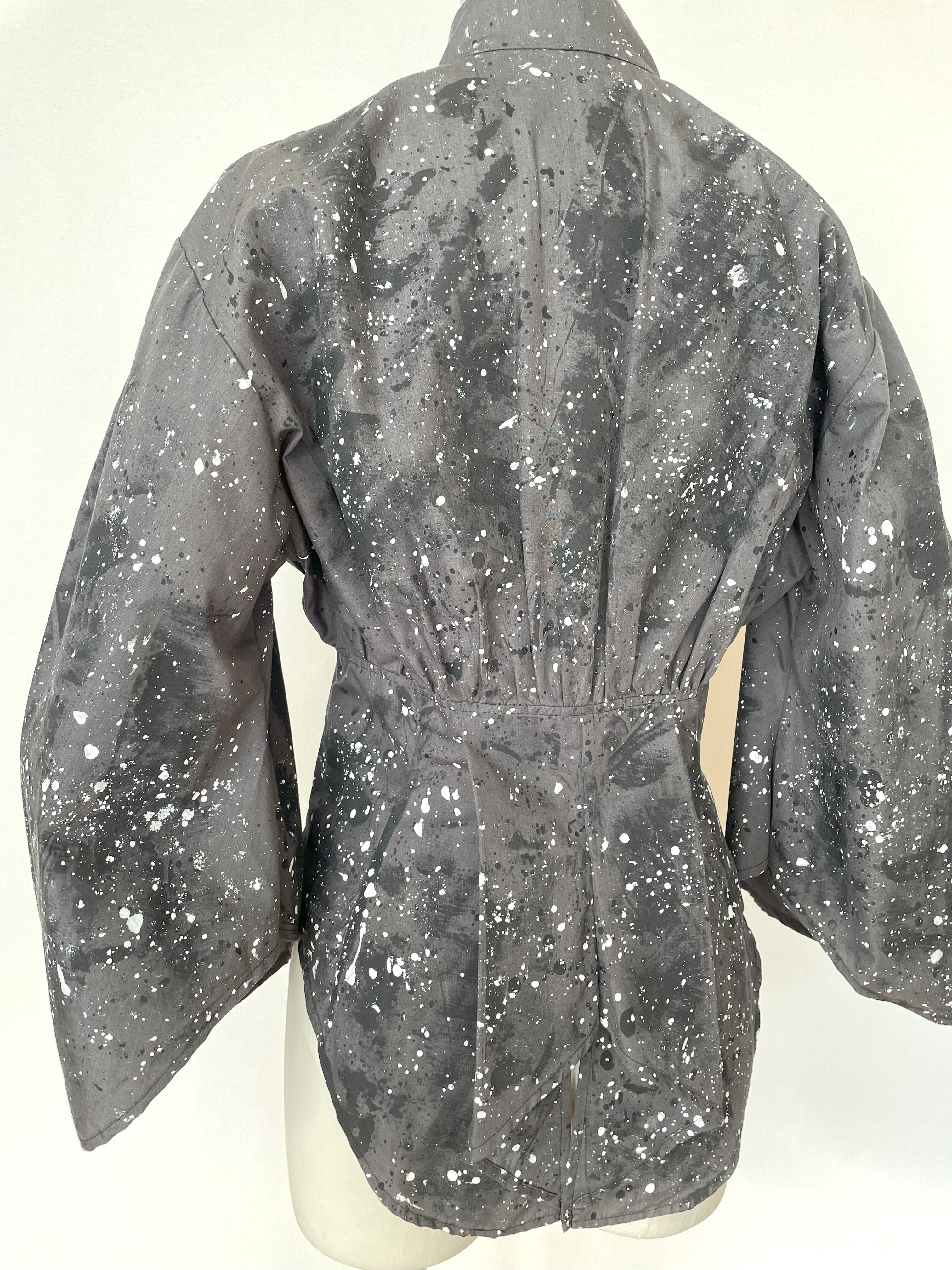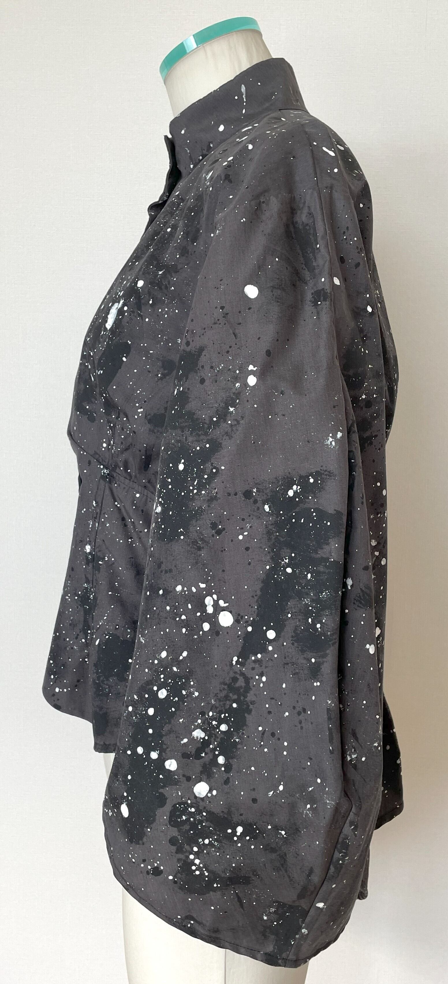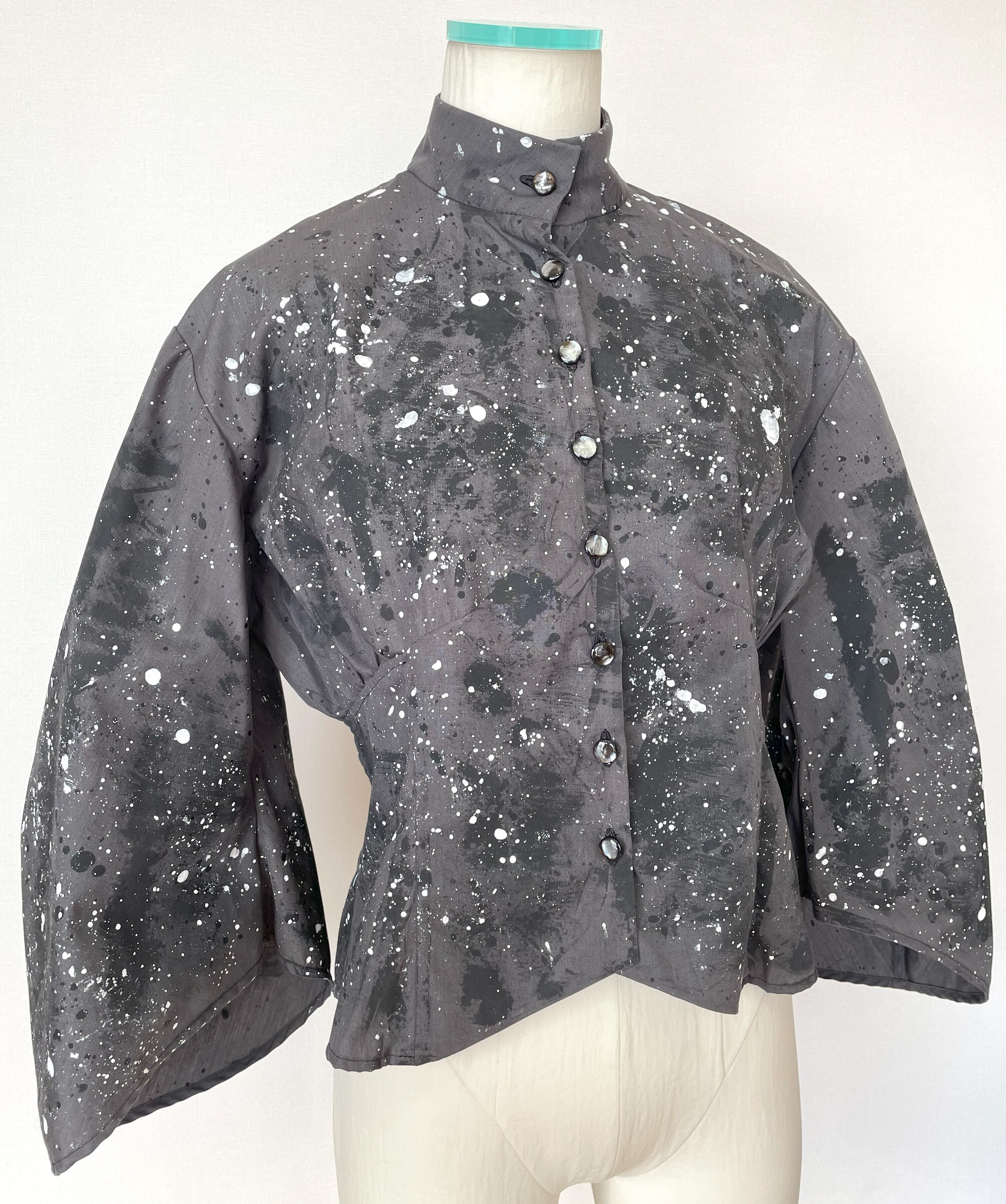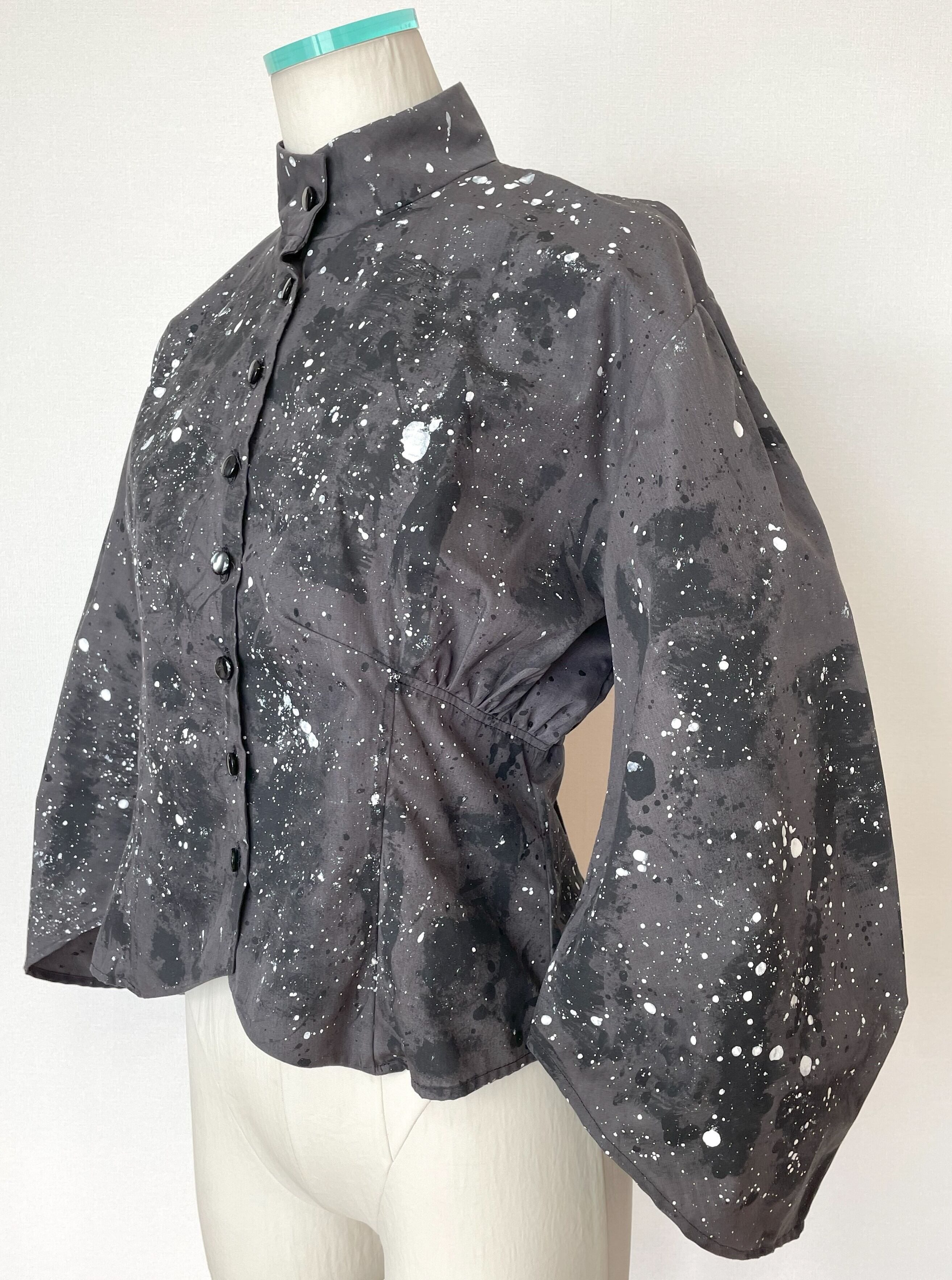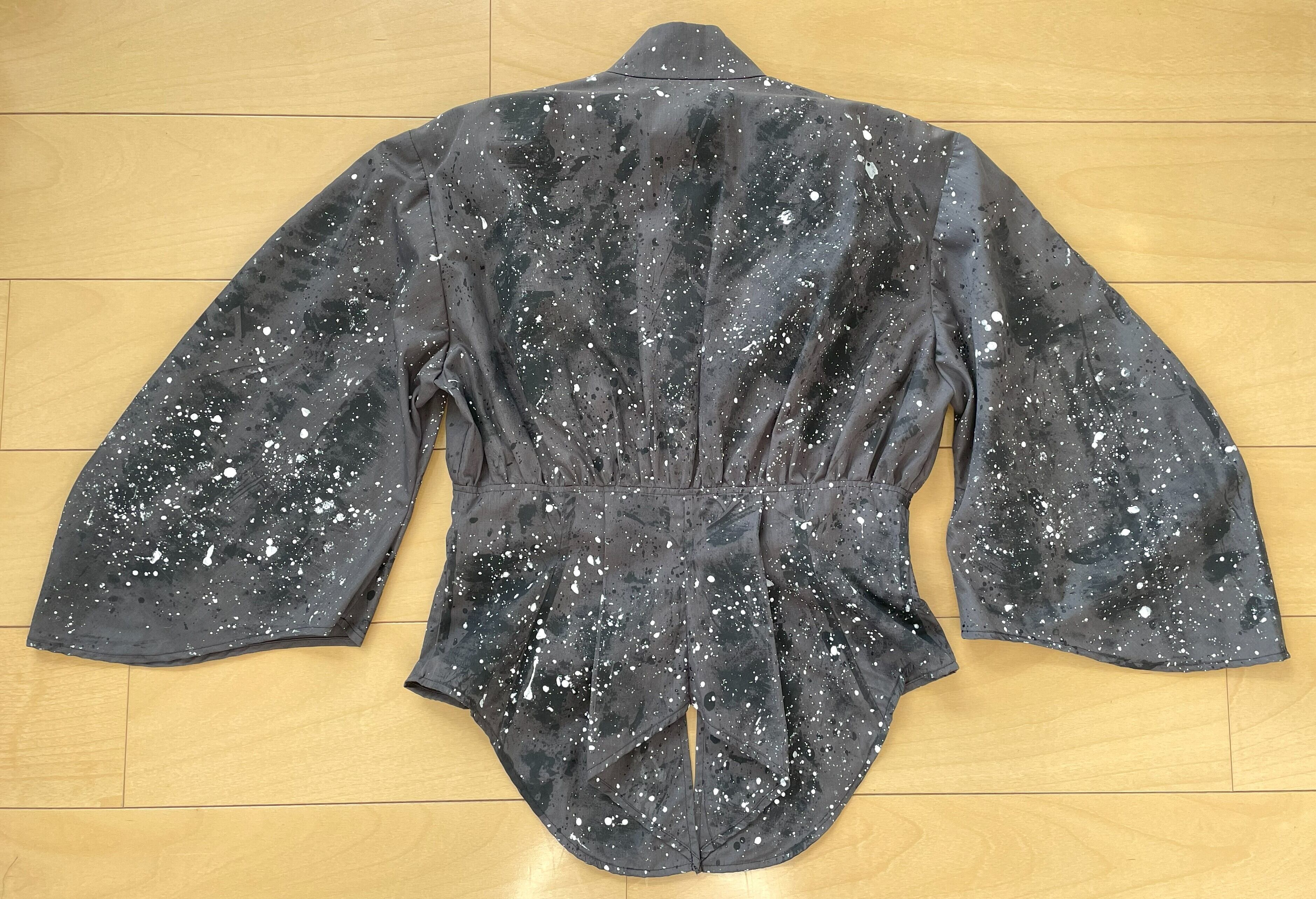生地用の絵の具を使い、直接生地にペイントしており、デザイン、型紙、縫製まですべての工程をデザイナー自身が一人で行った1点物です。