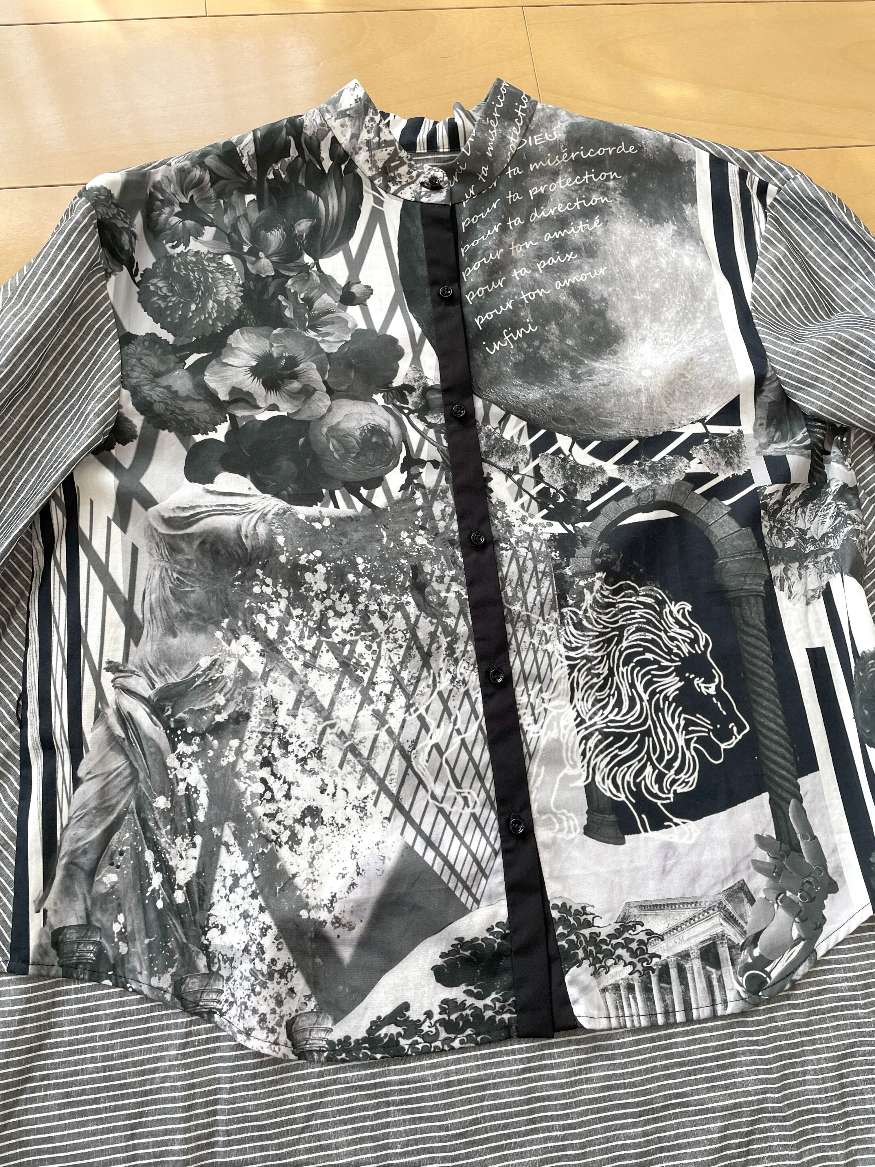 自身で描いたコラージュアートをプリントした生地で、型紙、縫製まですべての工程を一人で行った1点物です。