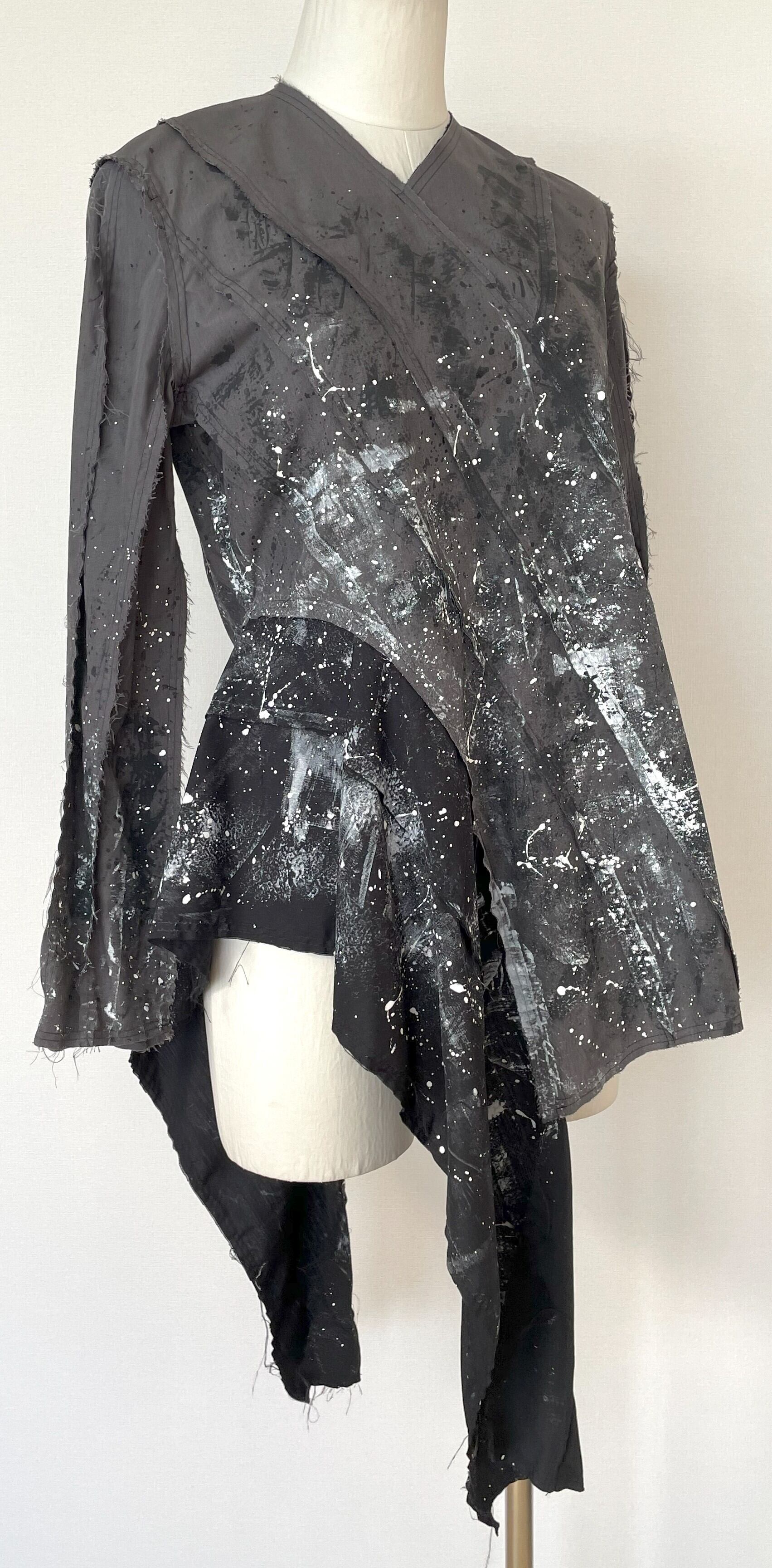 生地用の絵の具を使い、直接生地にペイントしており、デザイン、型紙、縫製まですべての工程をデザイナー自身が一人で行った1点物です。