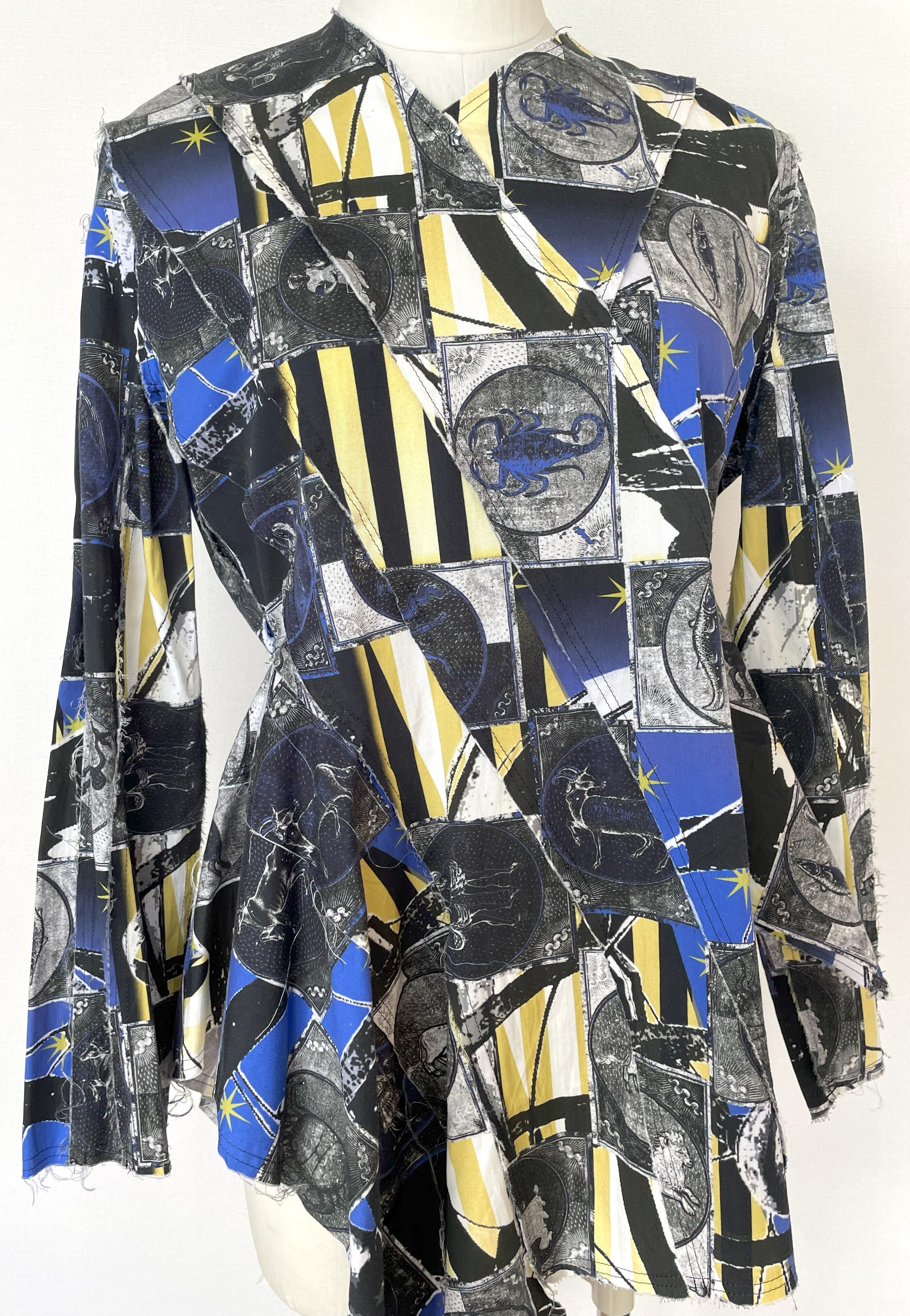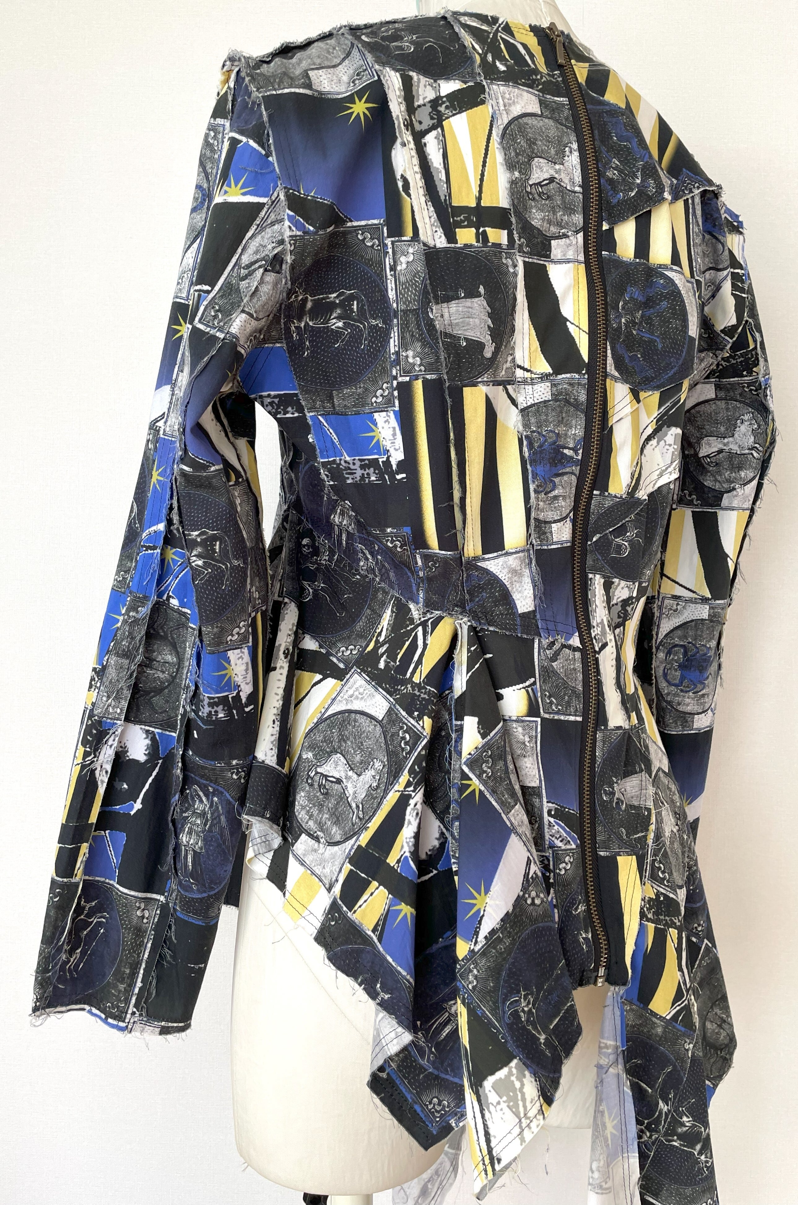 オリジナルのデジタルアートをプリントした生地で、デザイン、型紙、縫製まですべての工程をデザイナー自身が一人で行いました。
